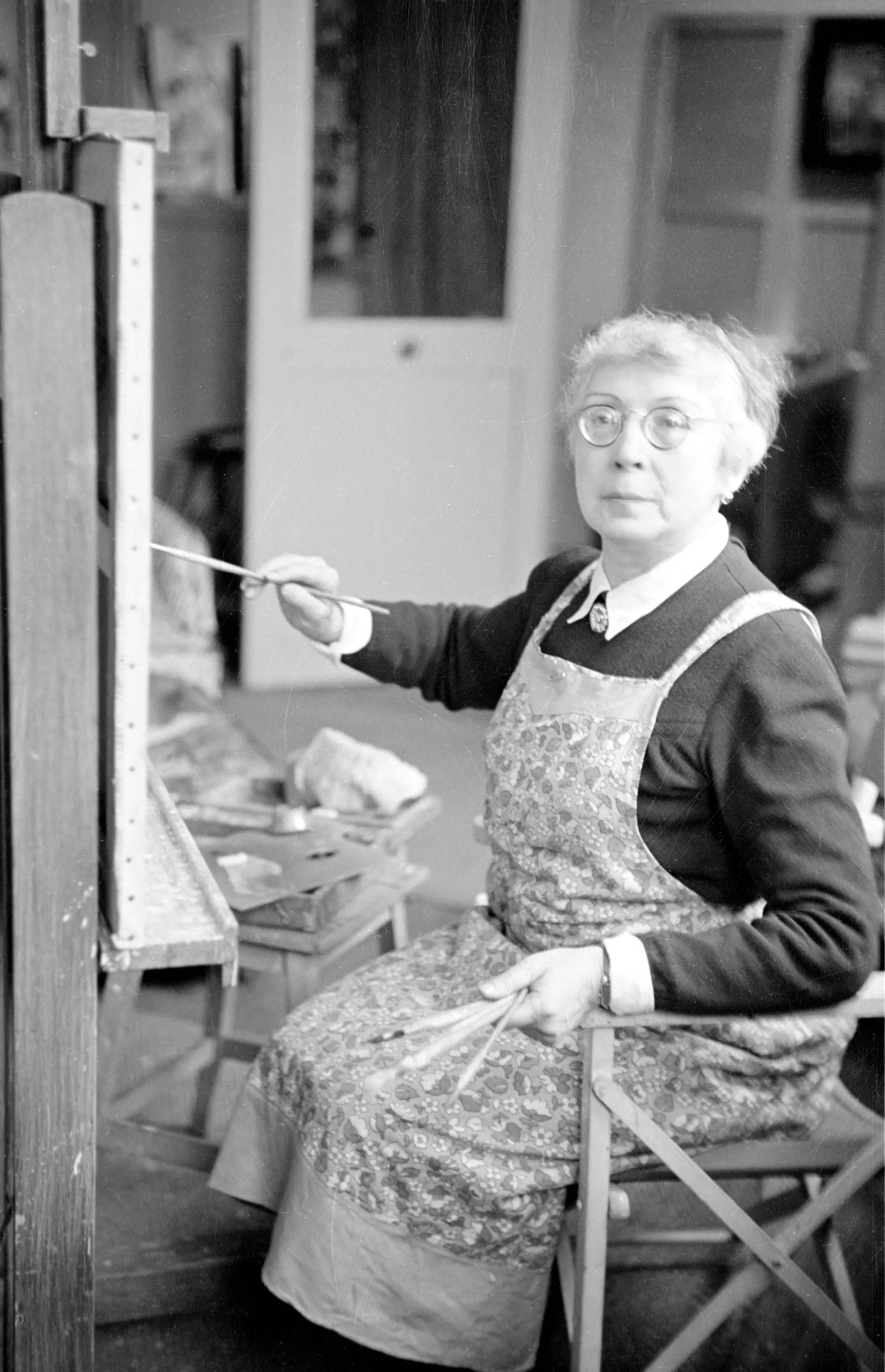 Black and white photograph of an older white woman seated at an easel, wearing a floral apron and round glasses, holding a paintbrush to a canvas