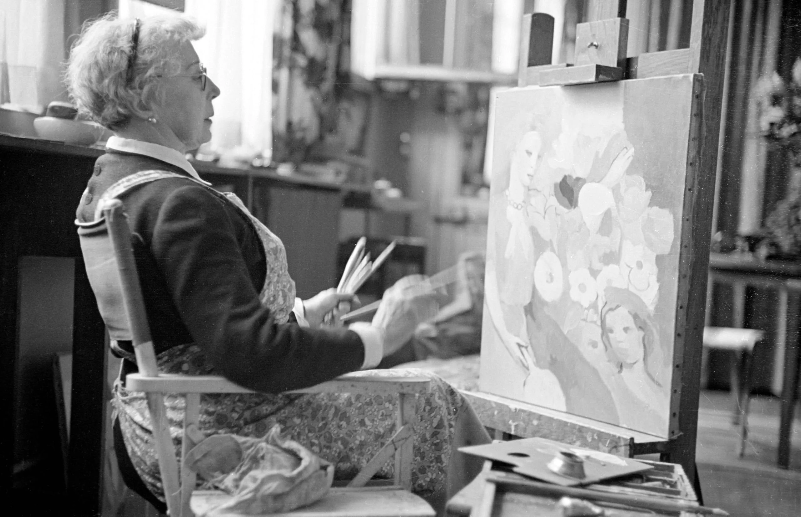 Black and white photograph of a woman with gray hair and glasses seated at an easel in an artist's studio, holding paintbrushes and working on a canvas depicting faces