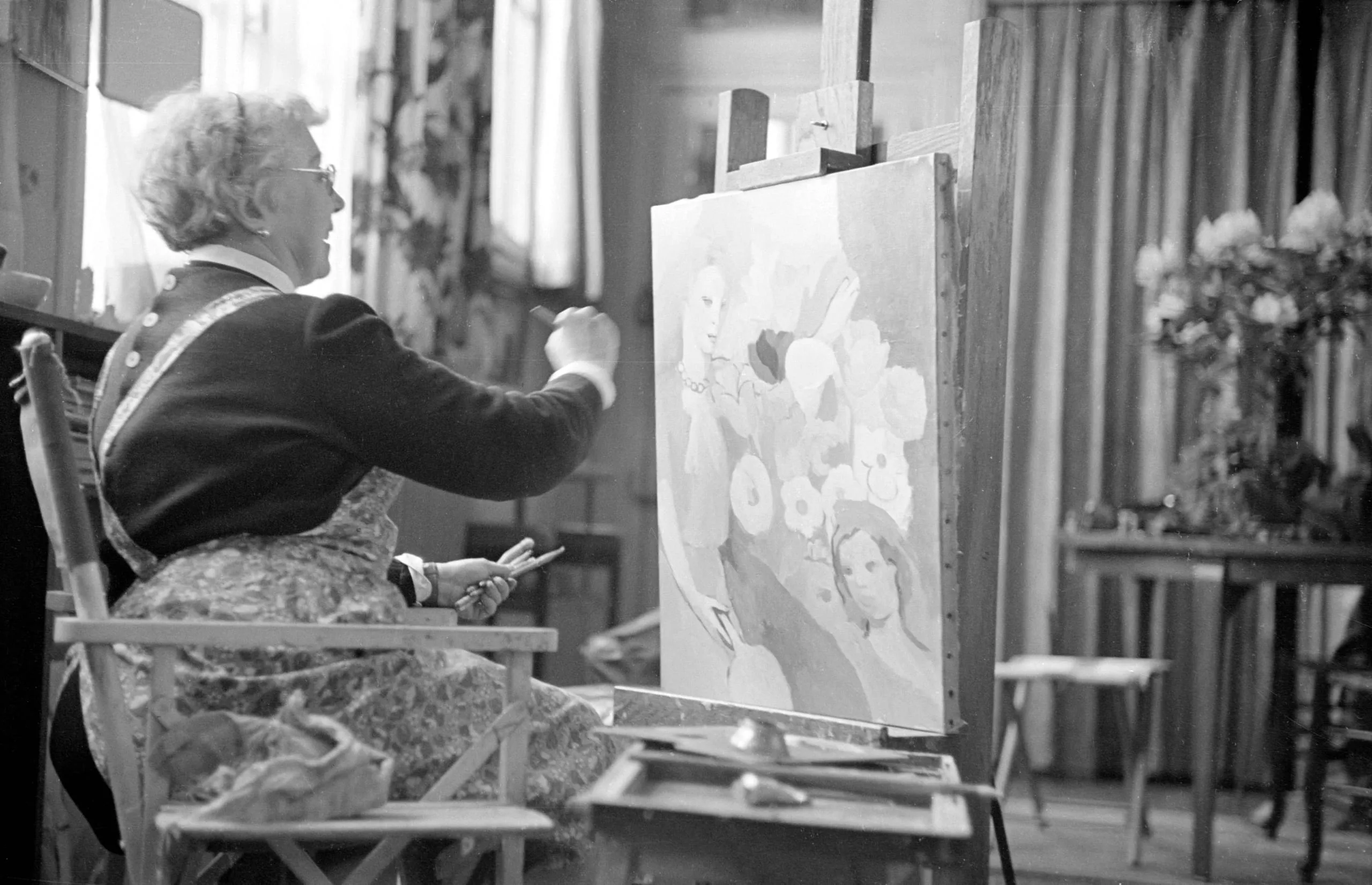 Black and white photograph of a white woman with short curly hair, seen from behind, seated and painting on a canvas mounted on an easel