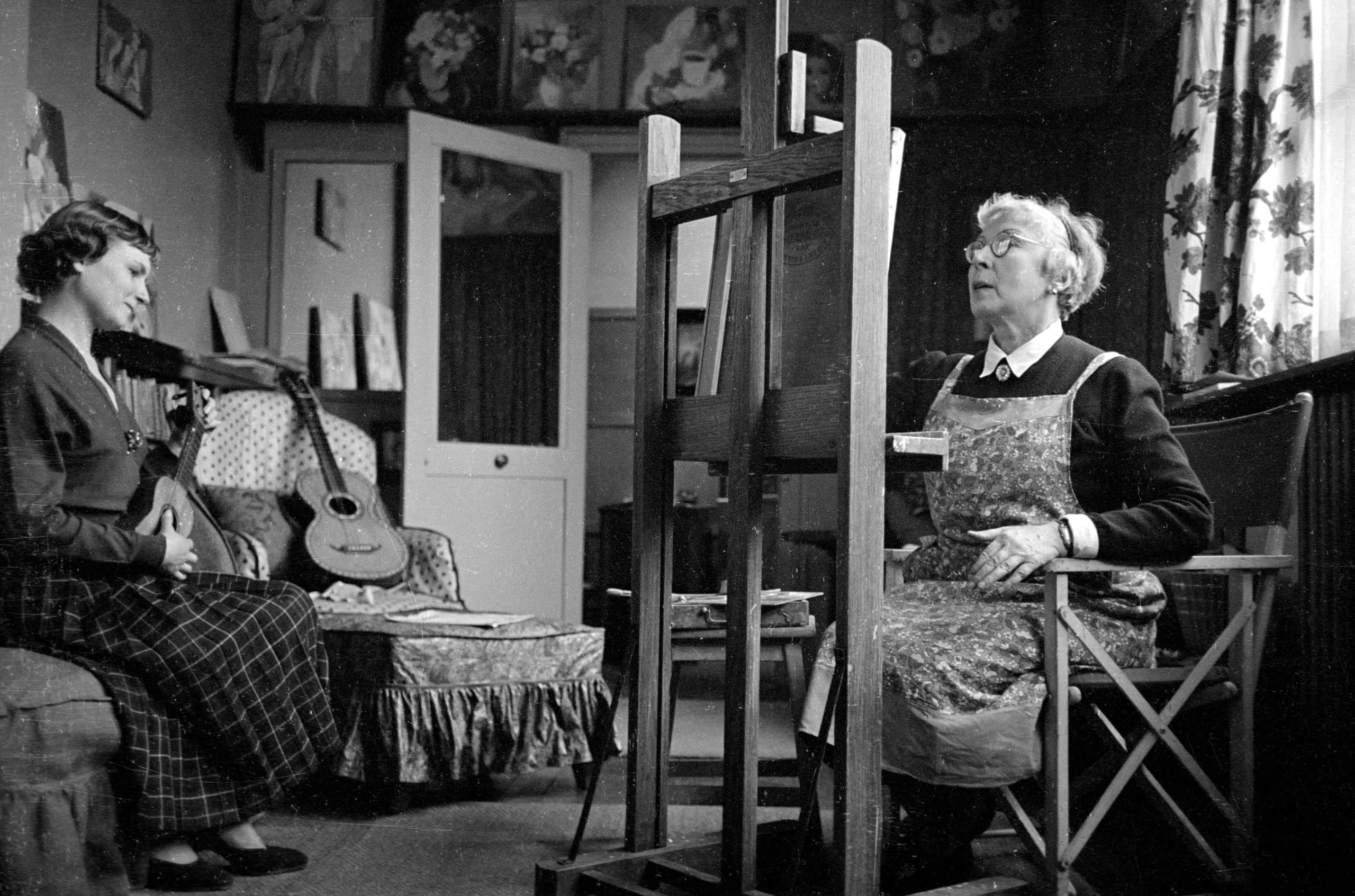 Black and white photograph of two women in a cluttered interior room — a younger woman holding a guitar on the left, an older woman in a paint-spattered apron seated by a tall wooden easel on the right