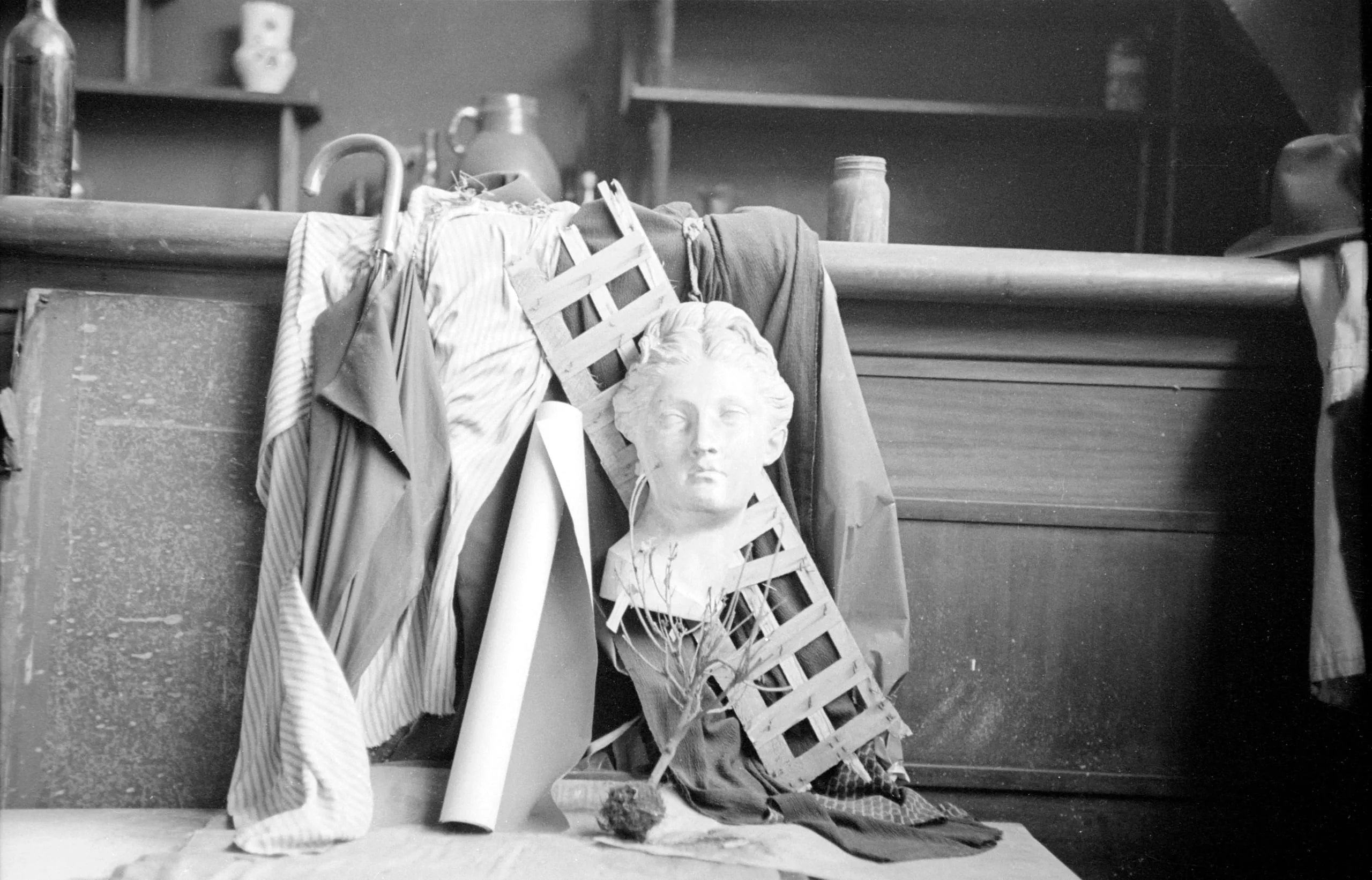 Black and white photograph of a plaster bust of a woman amid draped fabrics, a lattice panel, and studio objects arranged on a surface