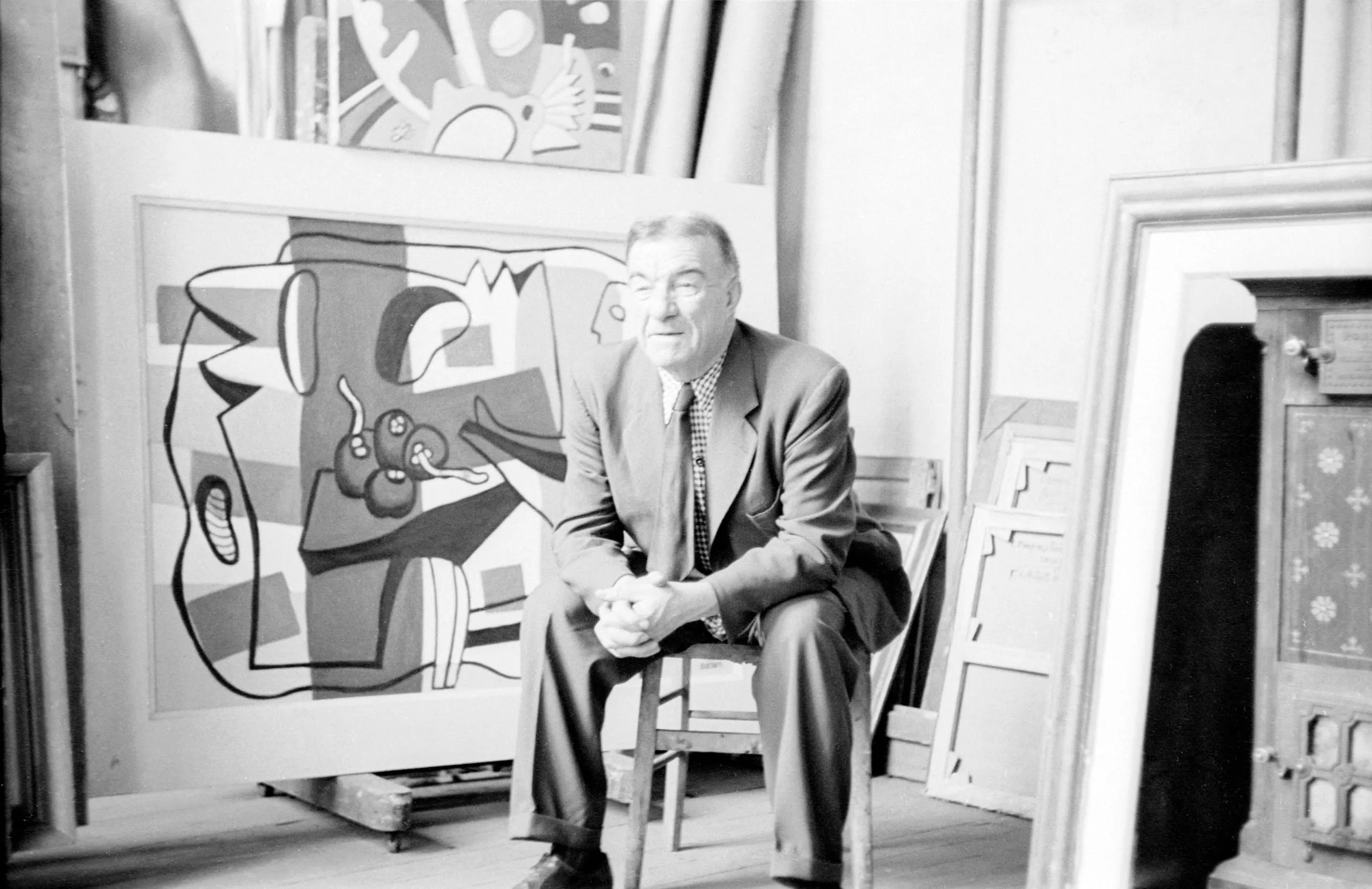 Black and white photograph of an older white man in a dark suit seated in a wooden chair inside an artist's studio, large Cubist-style paintings visible behind him