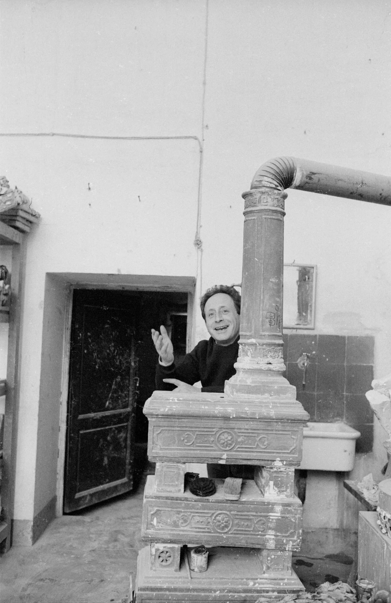 Black and white photograph, a man grins and raises one hand while standing behind a large ornate cast-iron stove in a bare plaster-walled room