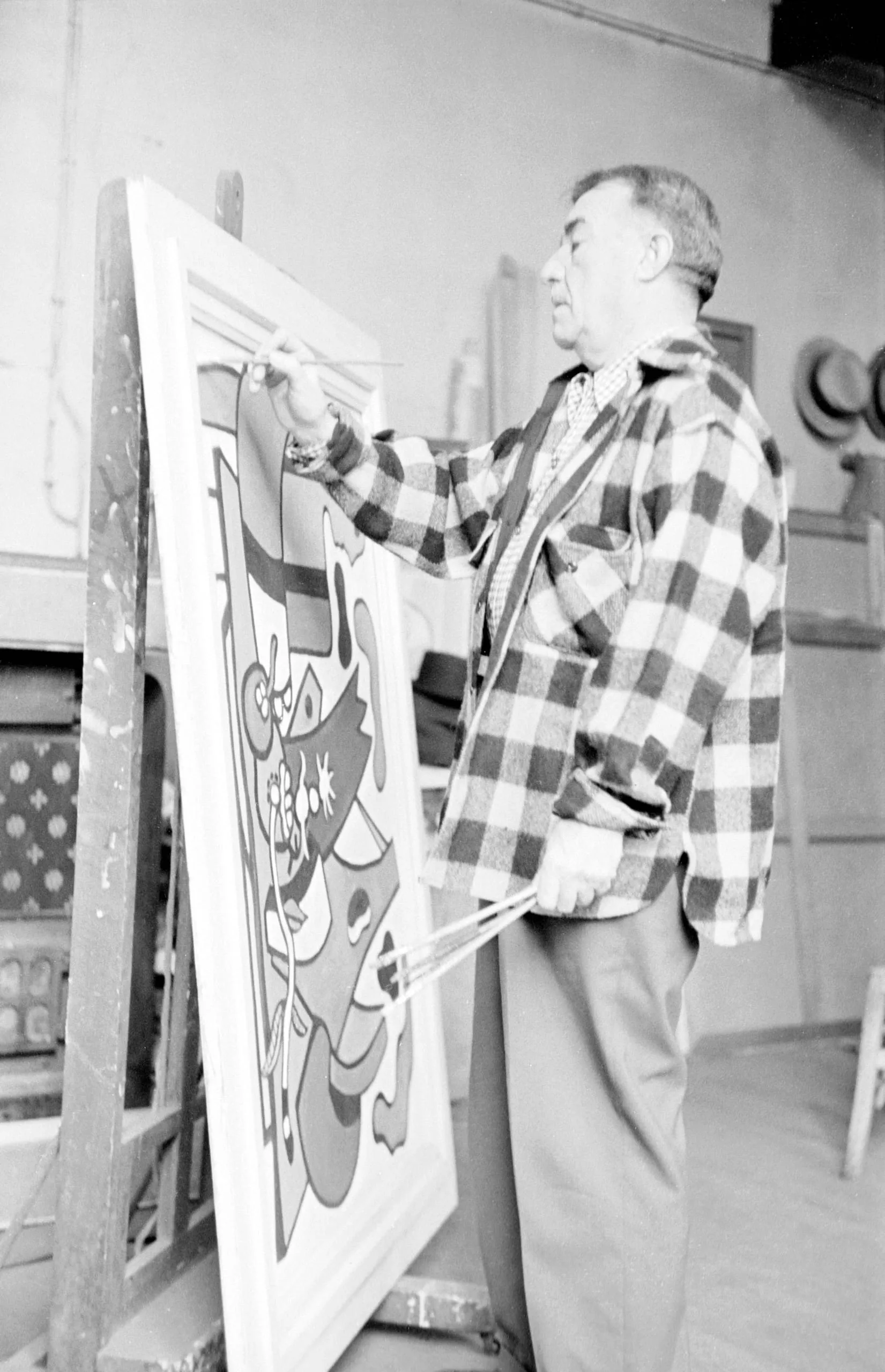 Black and white photograph of a heavyset man in a plaid flannel shirt painting a large abstract canvas on a wooden easel in a studio