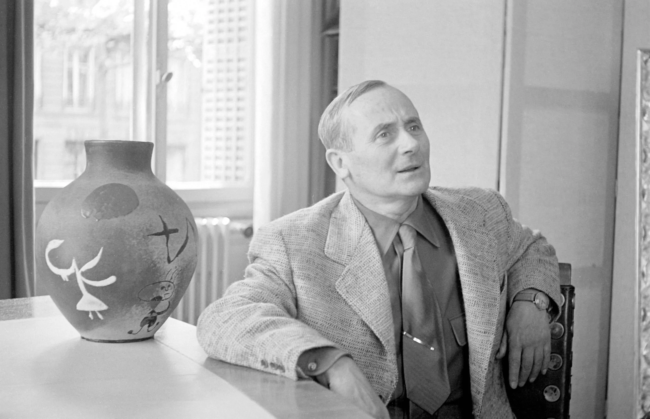 Black and white photograph of a man in a tweed sport coat seated at a table beside a large ceramic vase decorated with abstract figures, looking off to the left