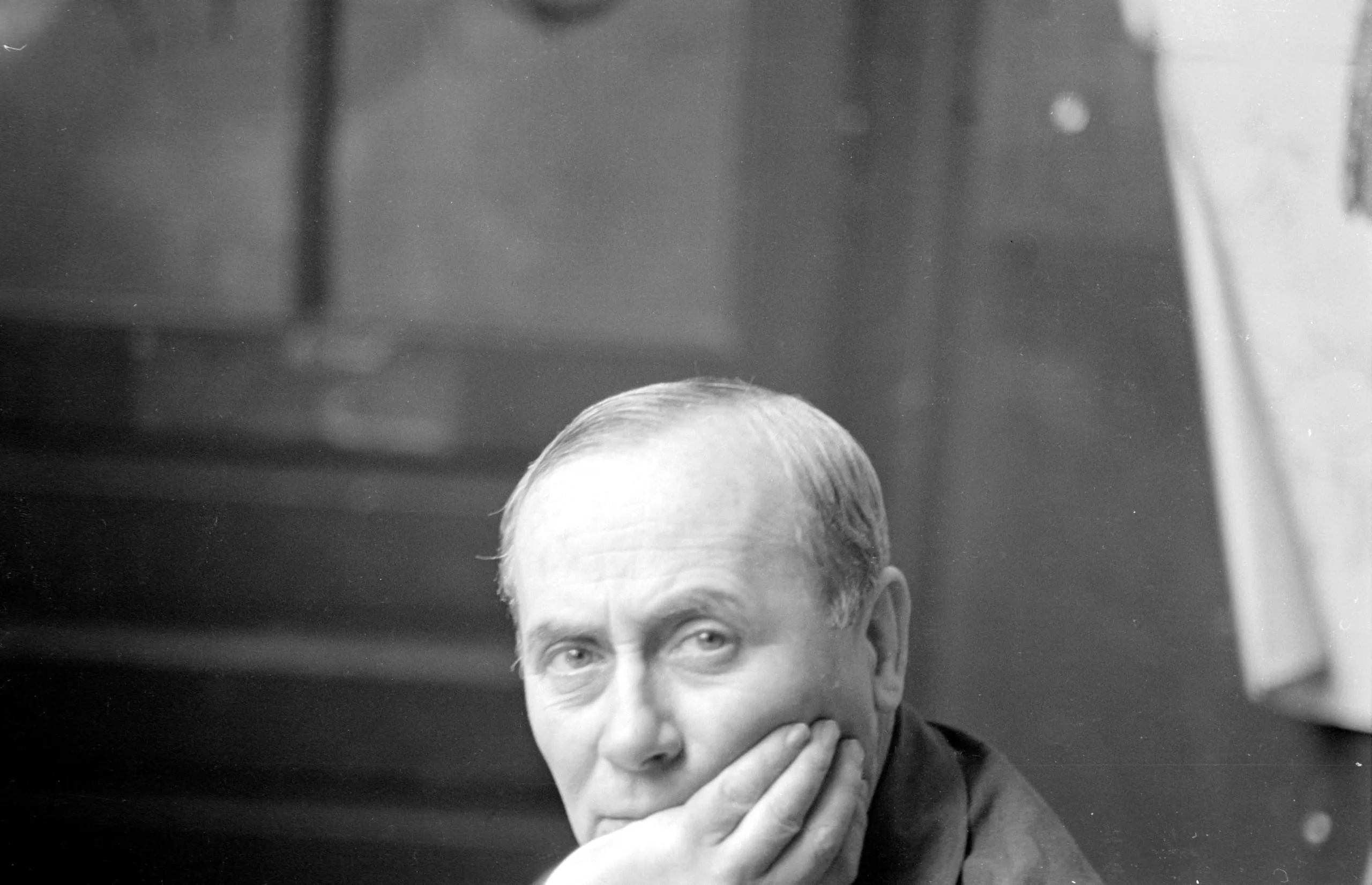 Black and white portrait photograph, close crop of a gray-haired white man looking directly at the camera, chin resting on his right hand, soft diffused lighting