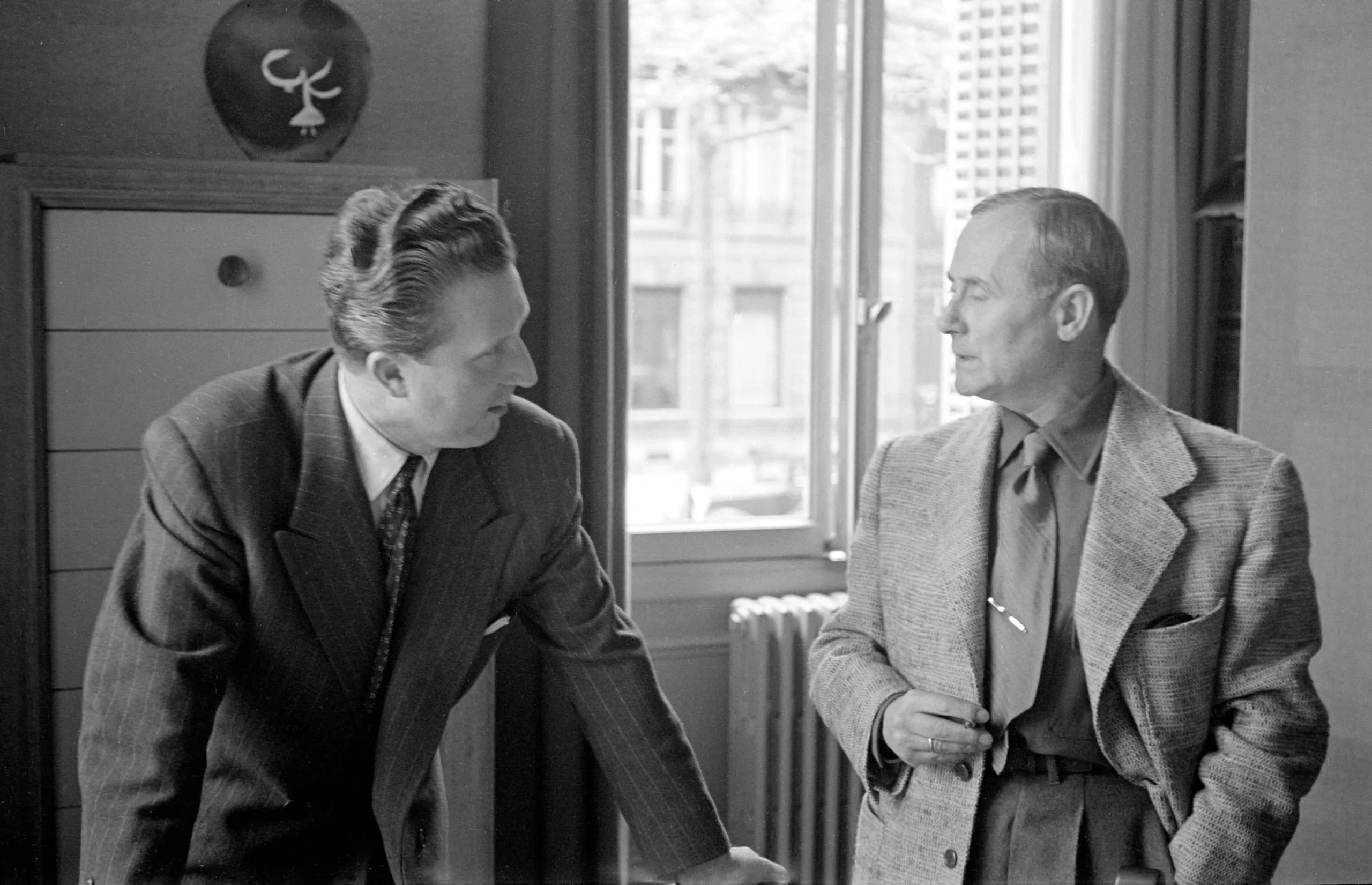 Black and white photograph of two men in suits facing each other in conversation inside a room, with a window and city building visible between them
