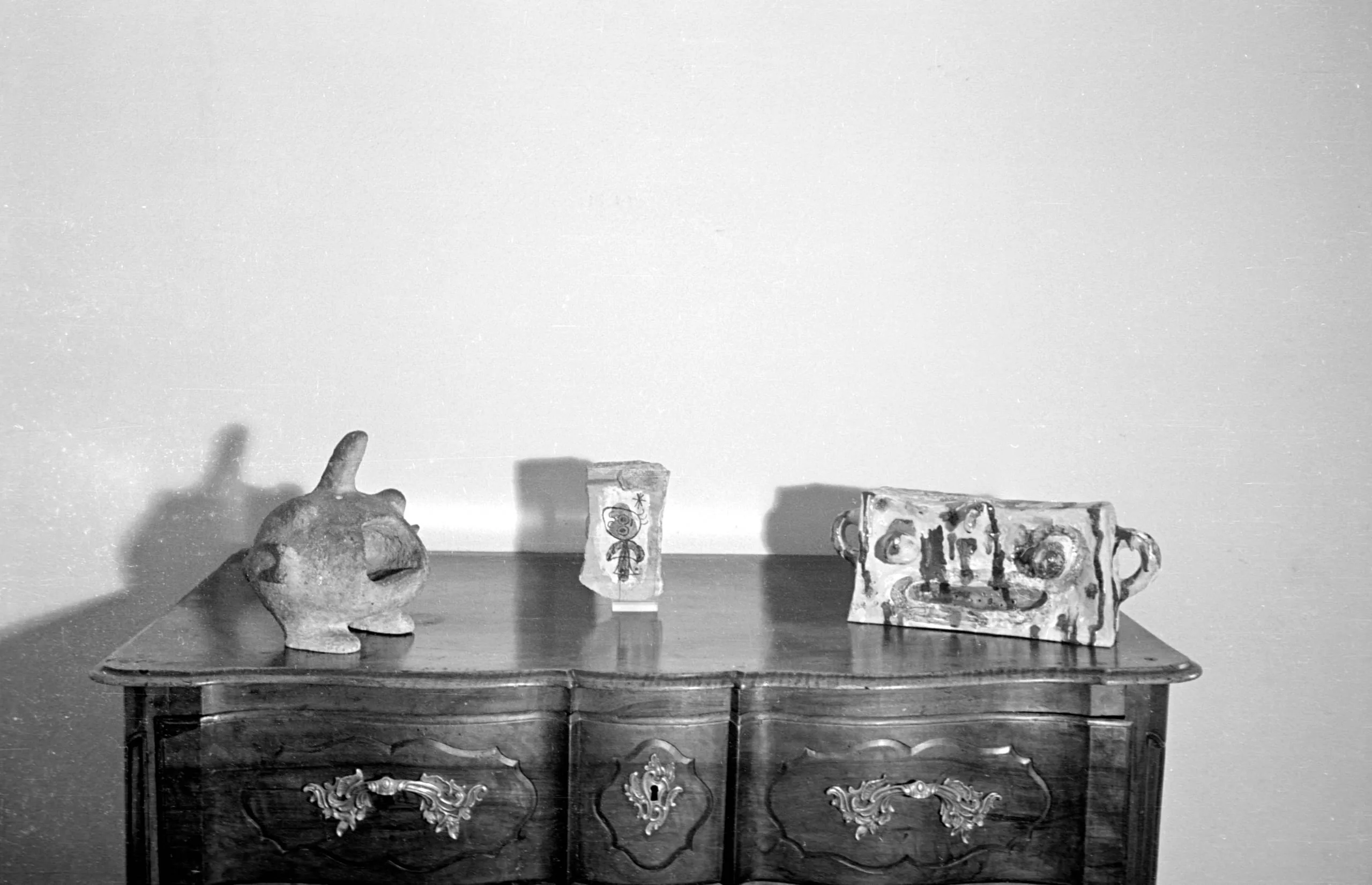 Black and white photograph of three small ceramic objects on a dark carved wooden chest of drawers: an animal figurine, a small decorated cup, and a flat inscribed plaque