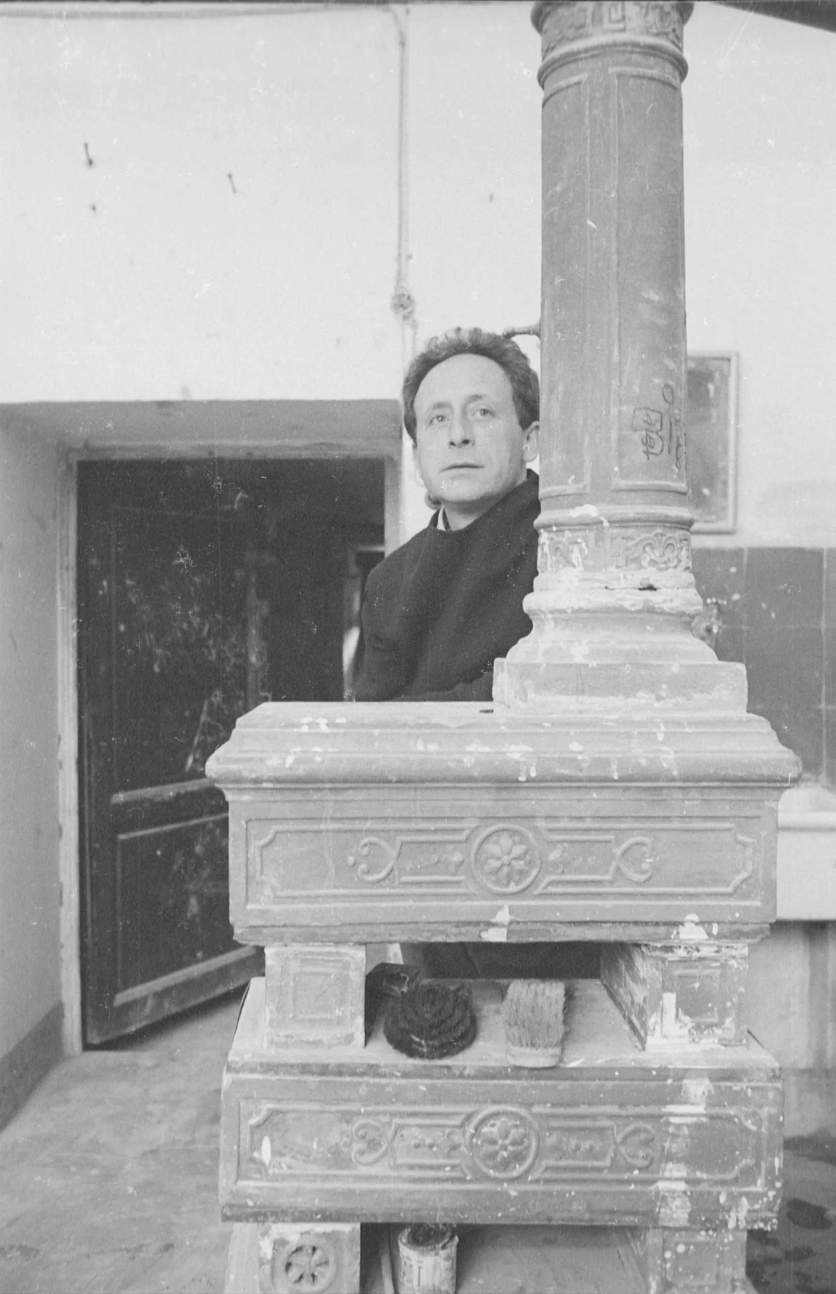 Black and white photograph, a man in a dark coat stands behind a worn, ornately carved column base in a bare interior room