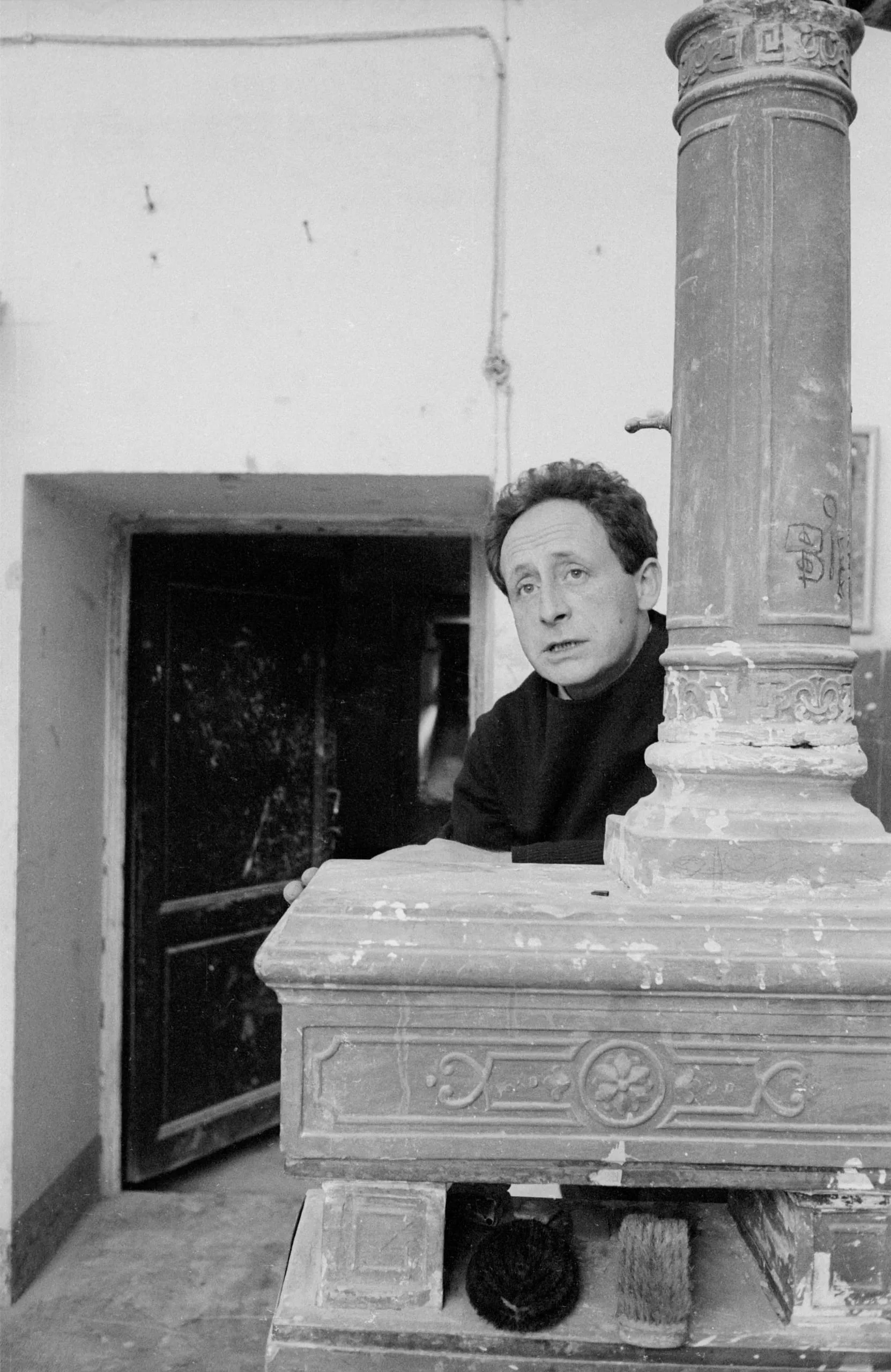 Black and white photograph of a man in a clerical collar peering over an ornate, worn stone pedestal, a dark doorway visible behind him