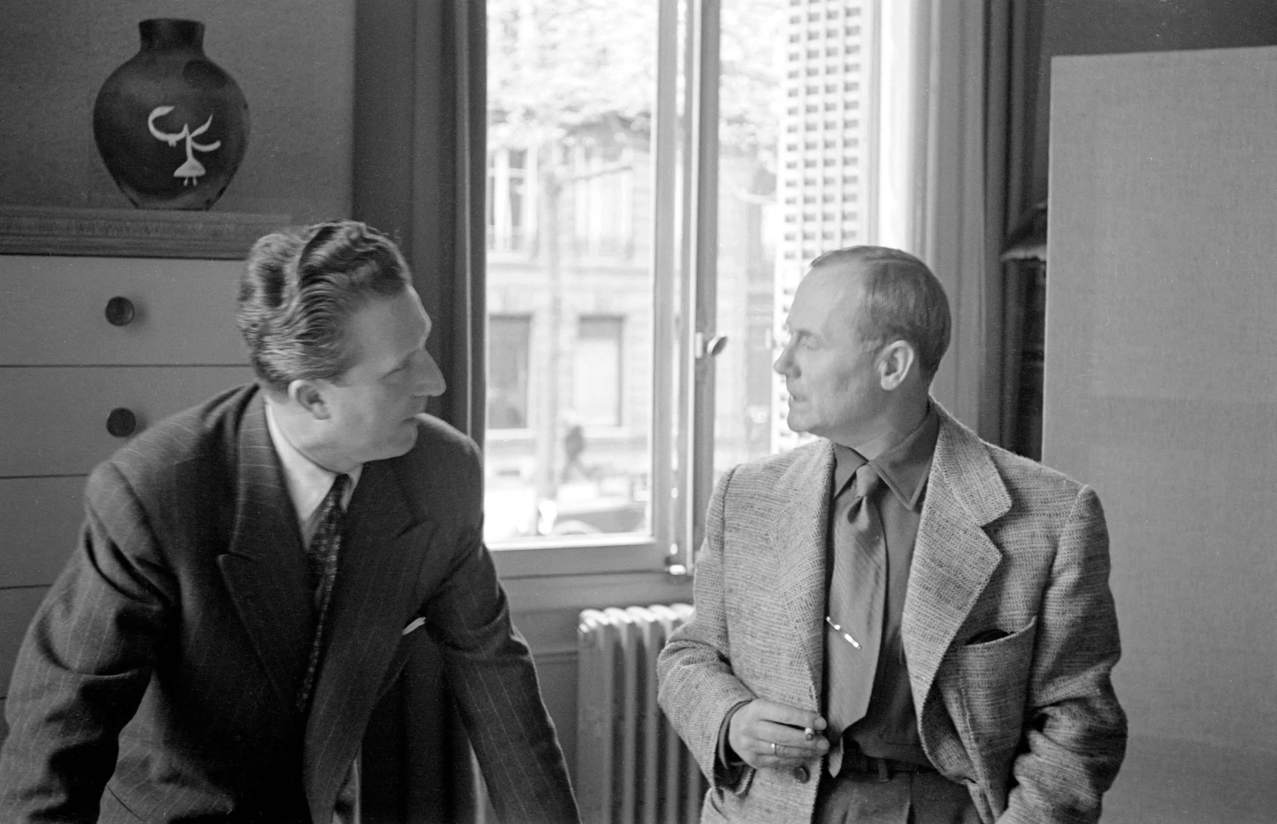 Black and white photograph of two men in suits conversing indoors in front of a window, a decorative ceramic vase visible on a shelf in the upper left