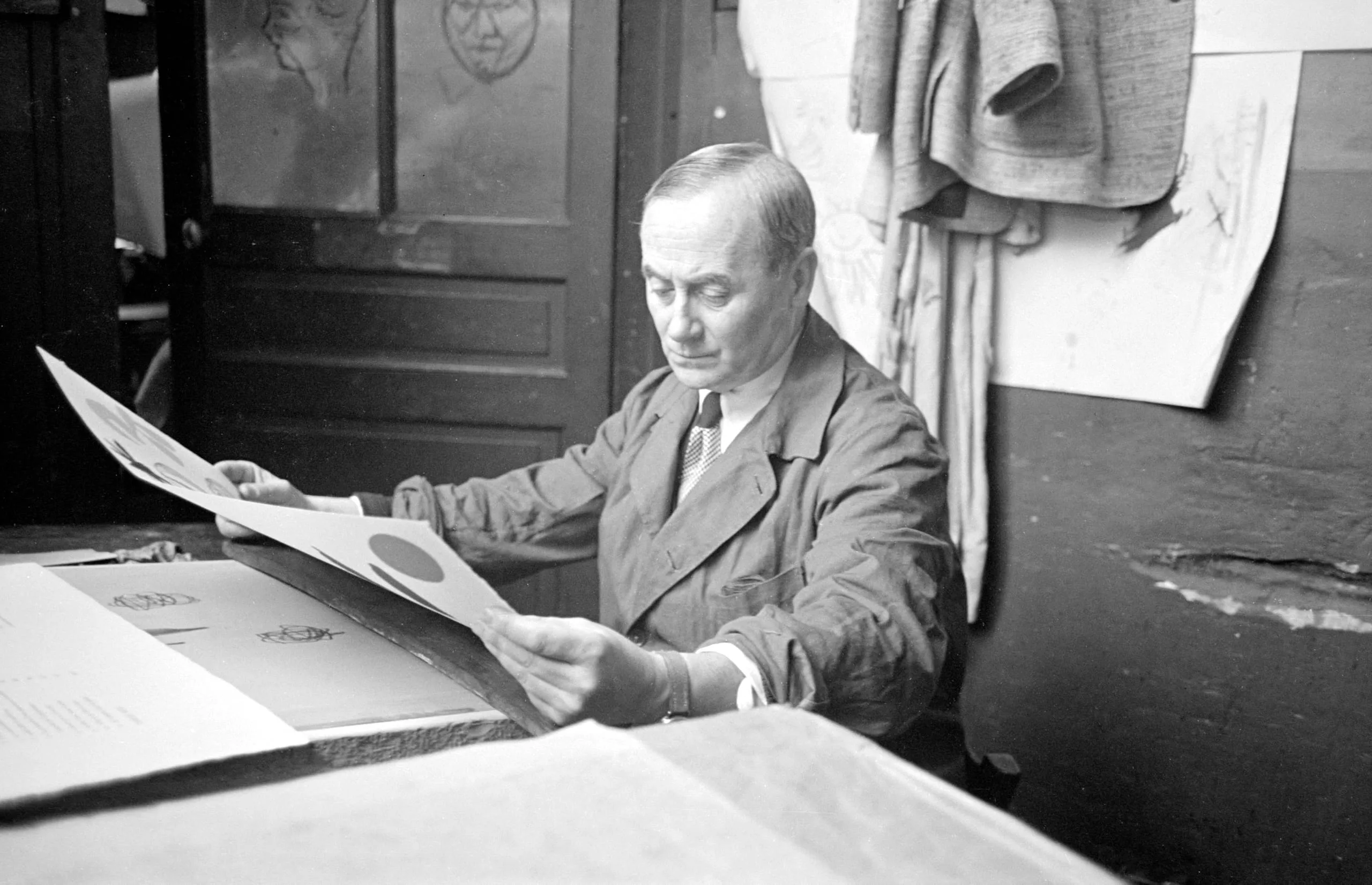 Black and white photograph of a white man in a work smock seated at a drafting table, examining a large printed sheet, with sketches pinned to the wall behind him