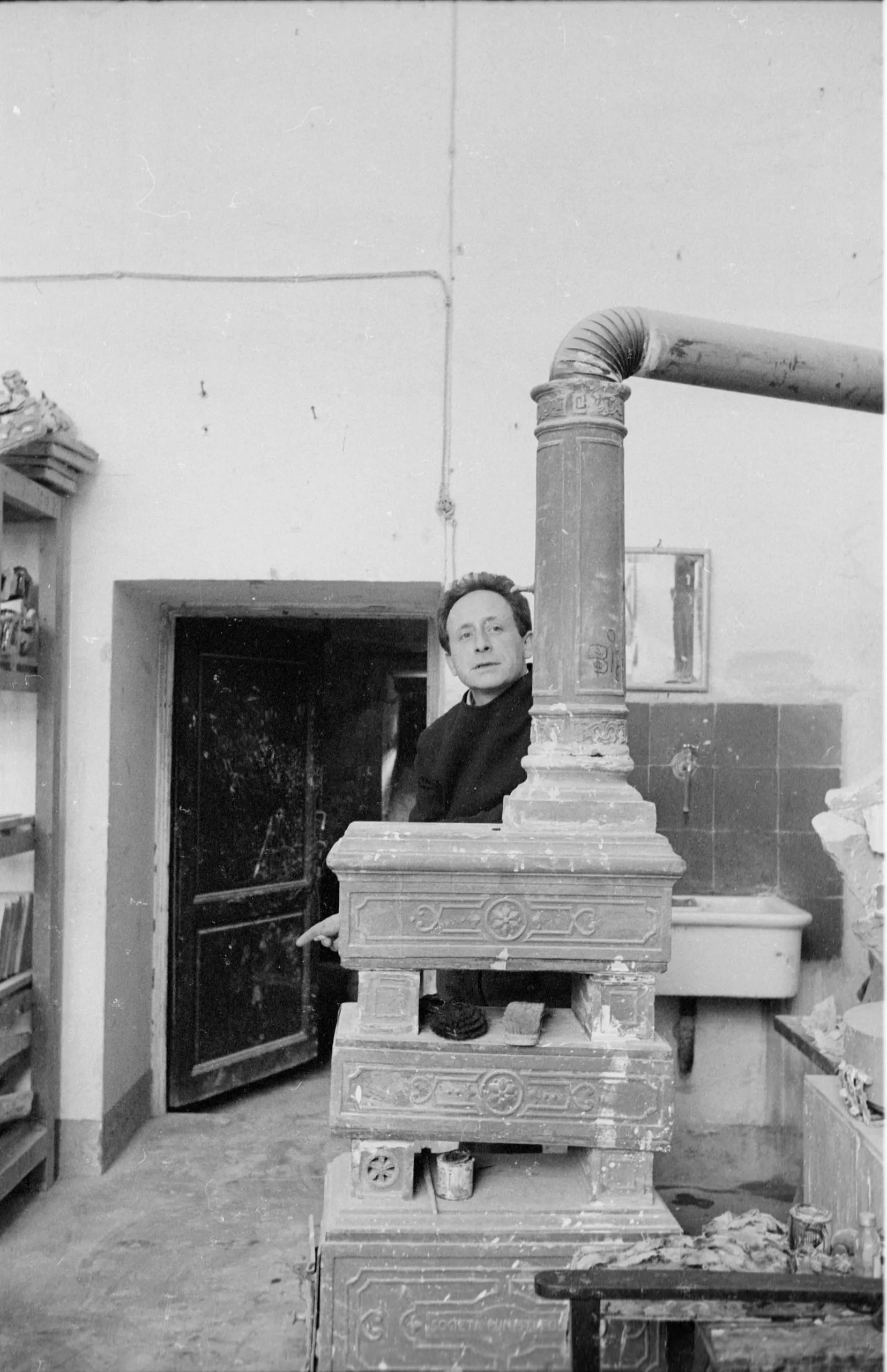 Black and white photograph, a dark-haired man in a black top stands behind a large ornate tiled stove with embossed decorative panels in an interior room