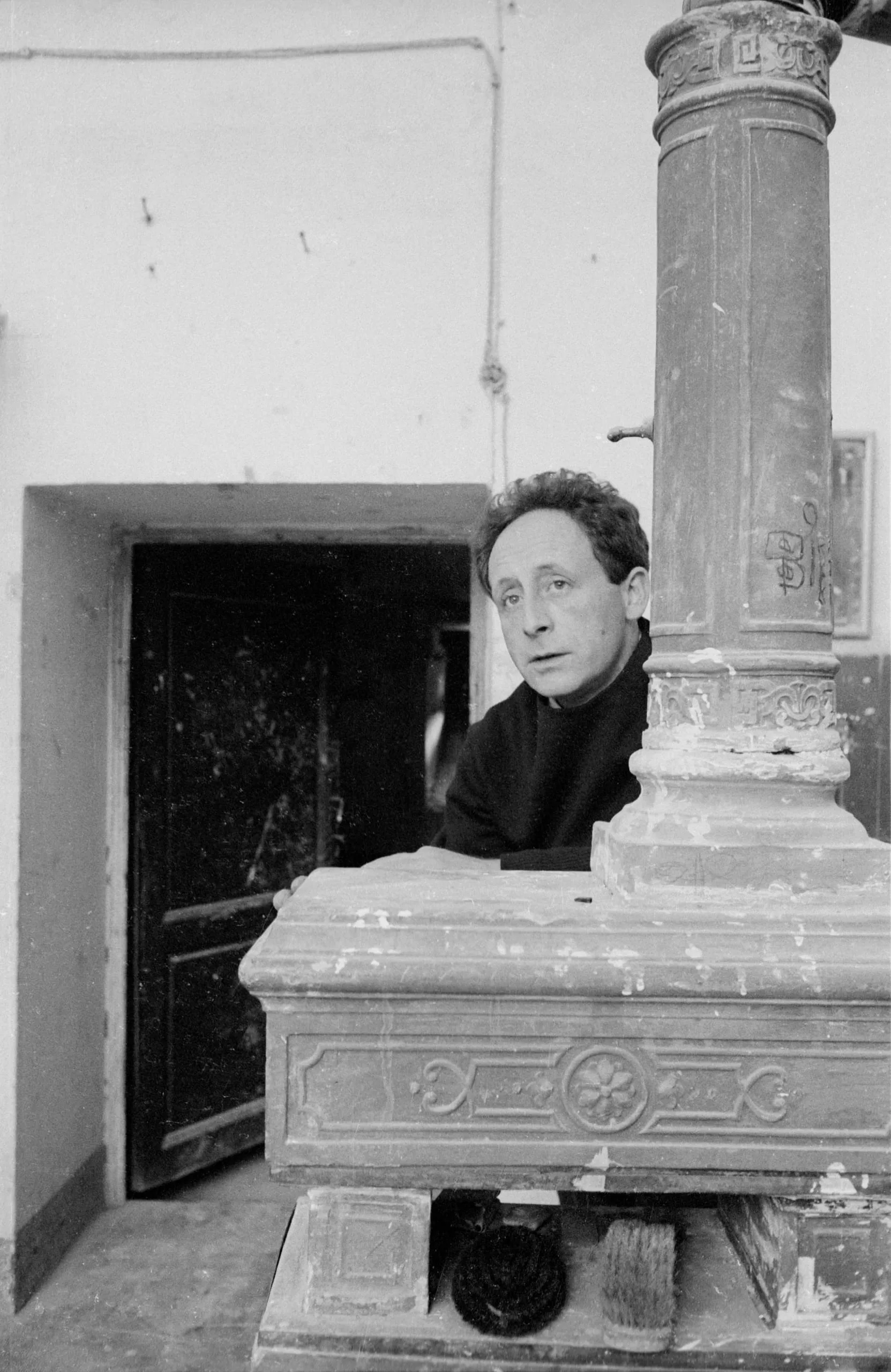 Black and white photograph of a man leaning over an ornate cast-iron stove, looking directly at the camera, with a dark open doorway behind him
