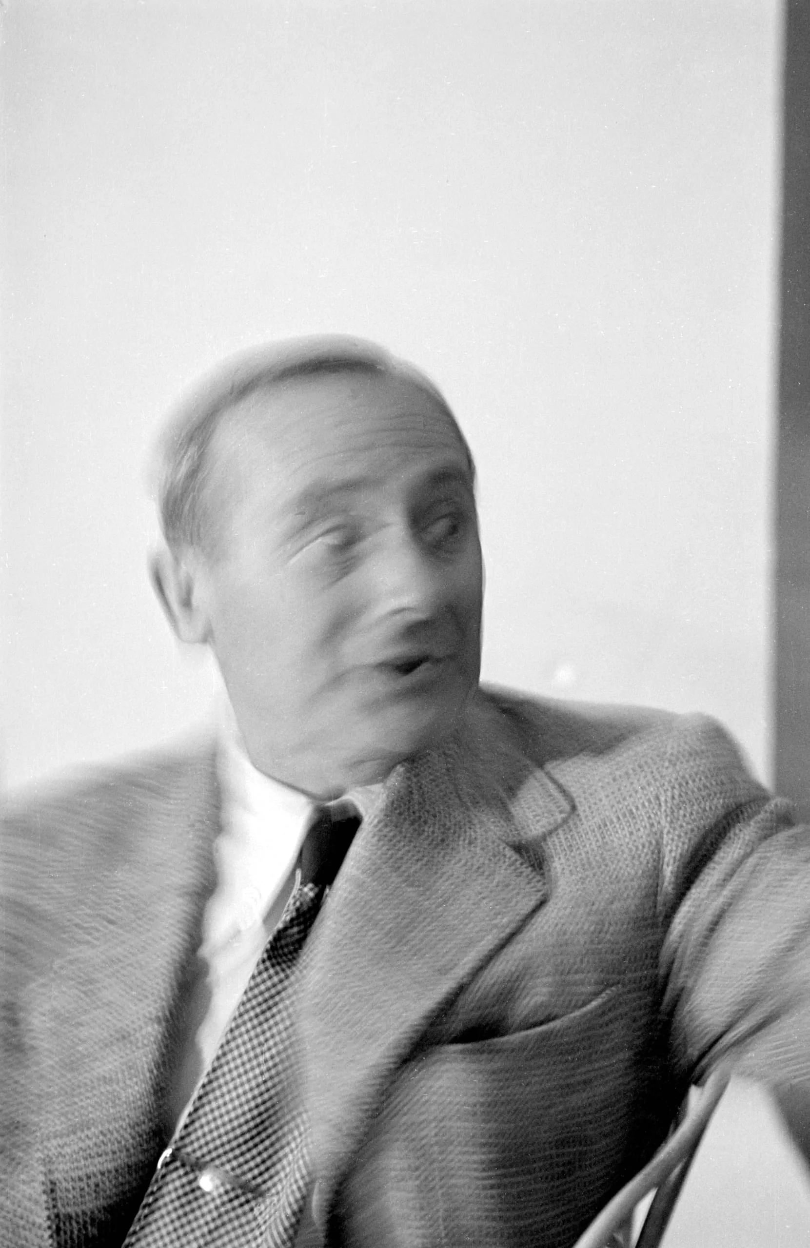 Black and white photograph of a seated white man in a suit and tie, chest-up, captured mid-motion with significant motion blur