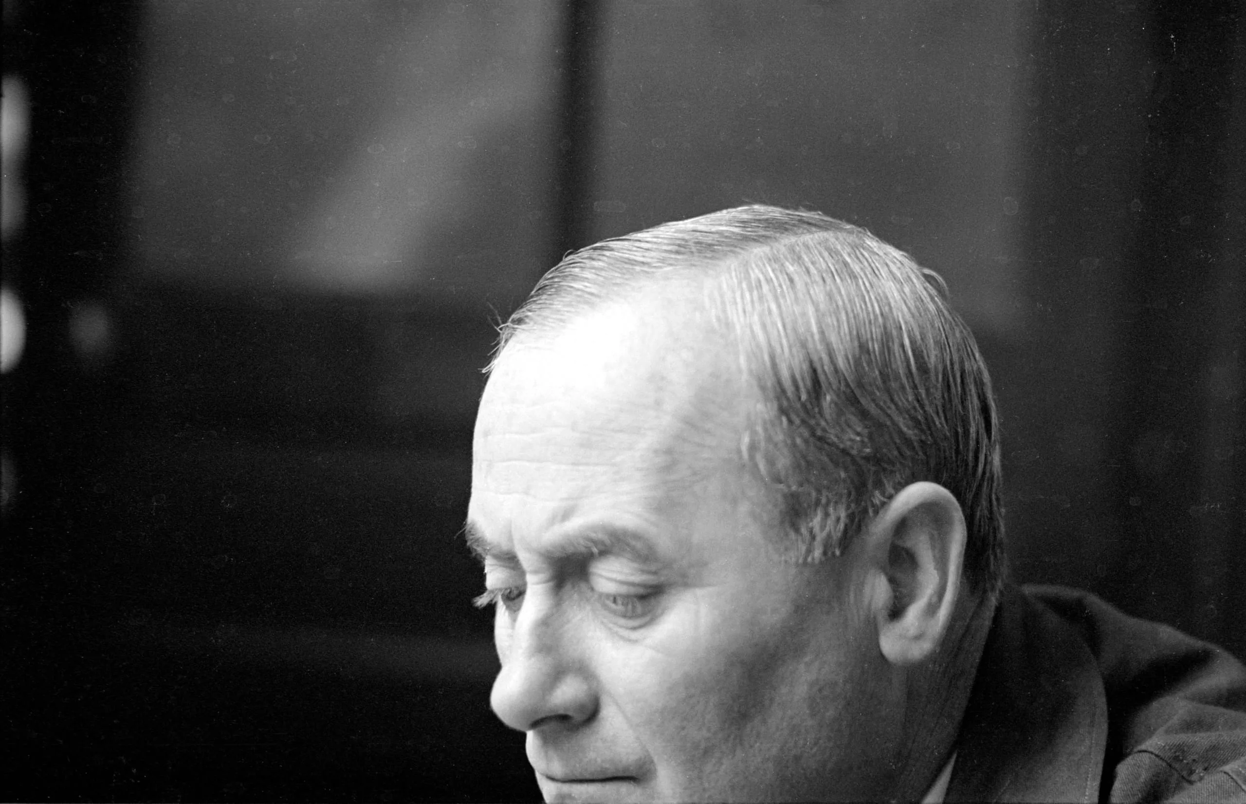 Black and white portrait photograph of a white man with short light hair, face angled downward, softly lit from the left