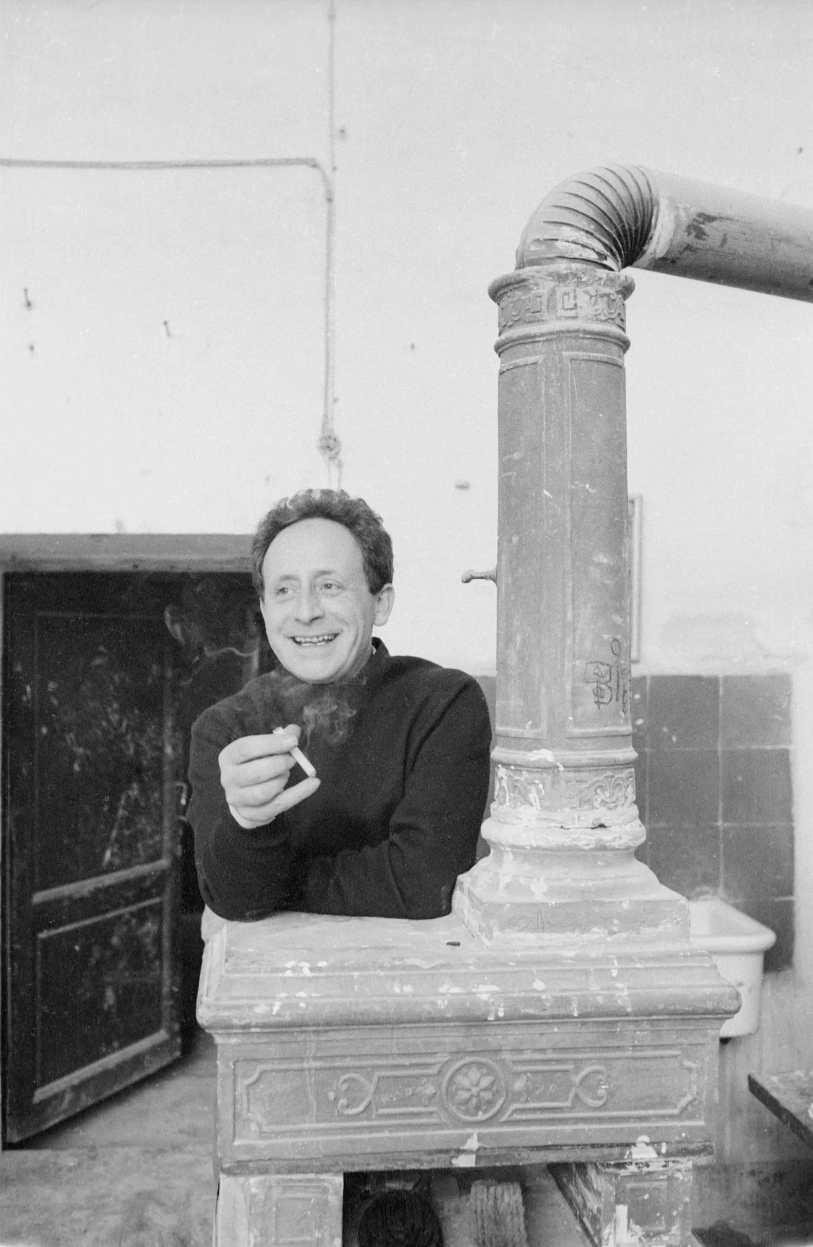 Black and white photograph of a man in a turtleneck leaning on an ornate cast-iron stove, smiling, holding a cigarette with smoke rising