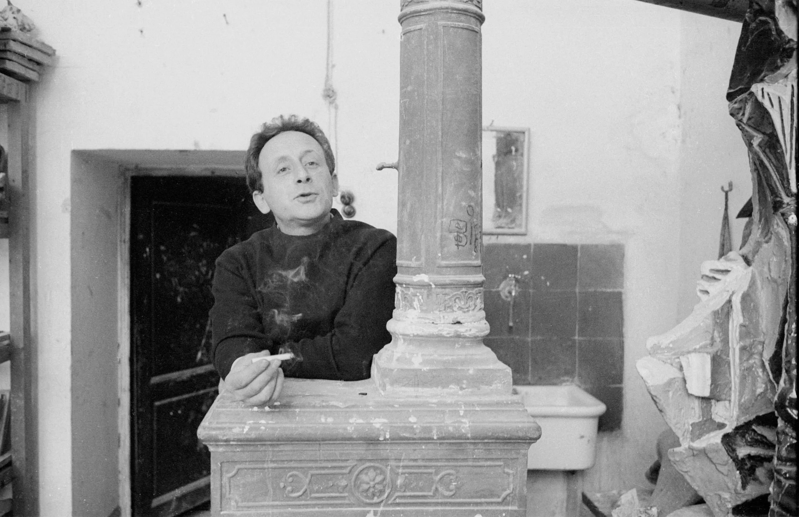 Black and white photograph of a man in a paint-spattered dark sweater standing behind an ornate cast-iron stove, holding a cigarette, in what appears to be an artist's studio