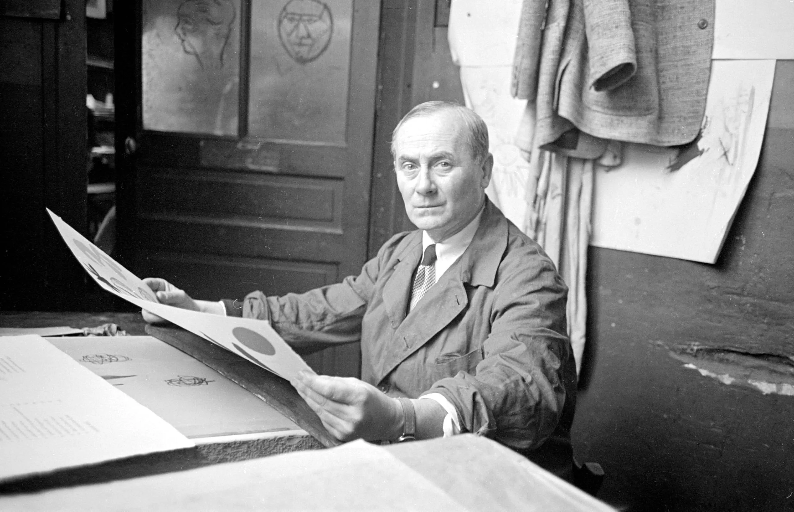 Black and white photograph of a white man in a work smock seated at a large table, holding a printed sheet, with sketches pinned to the wall behind him