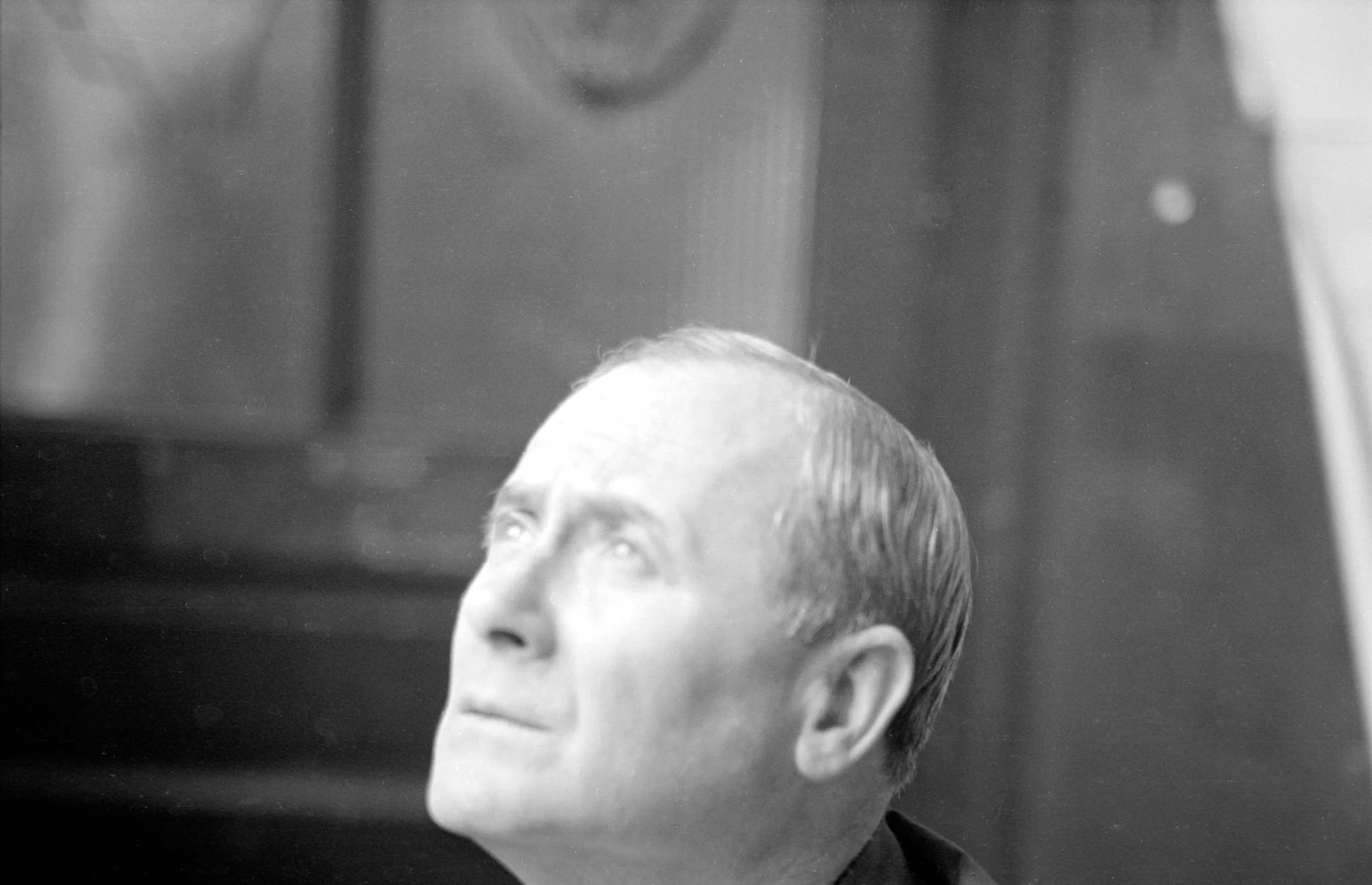 Black and white photograph, close-up portrait of a white man with close-cropped gray hair, face tilted upward, strongly lit from the right