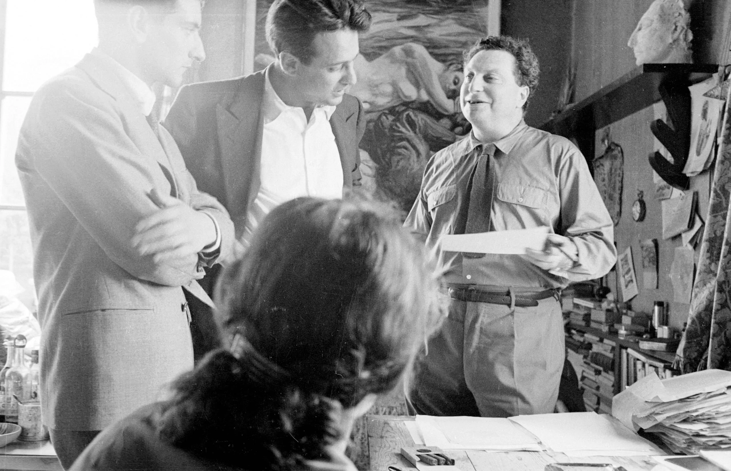 Black and white photograph of four people in an artist's studio, three men conversing while one holds papers, a fourth figure seated with back to camera