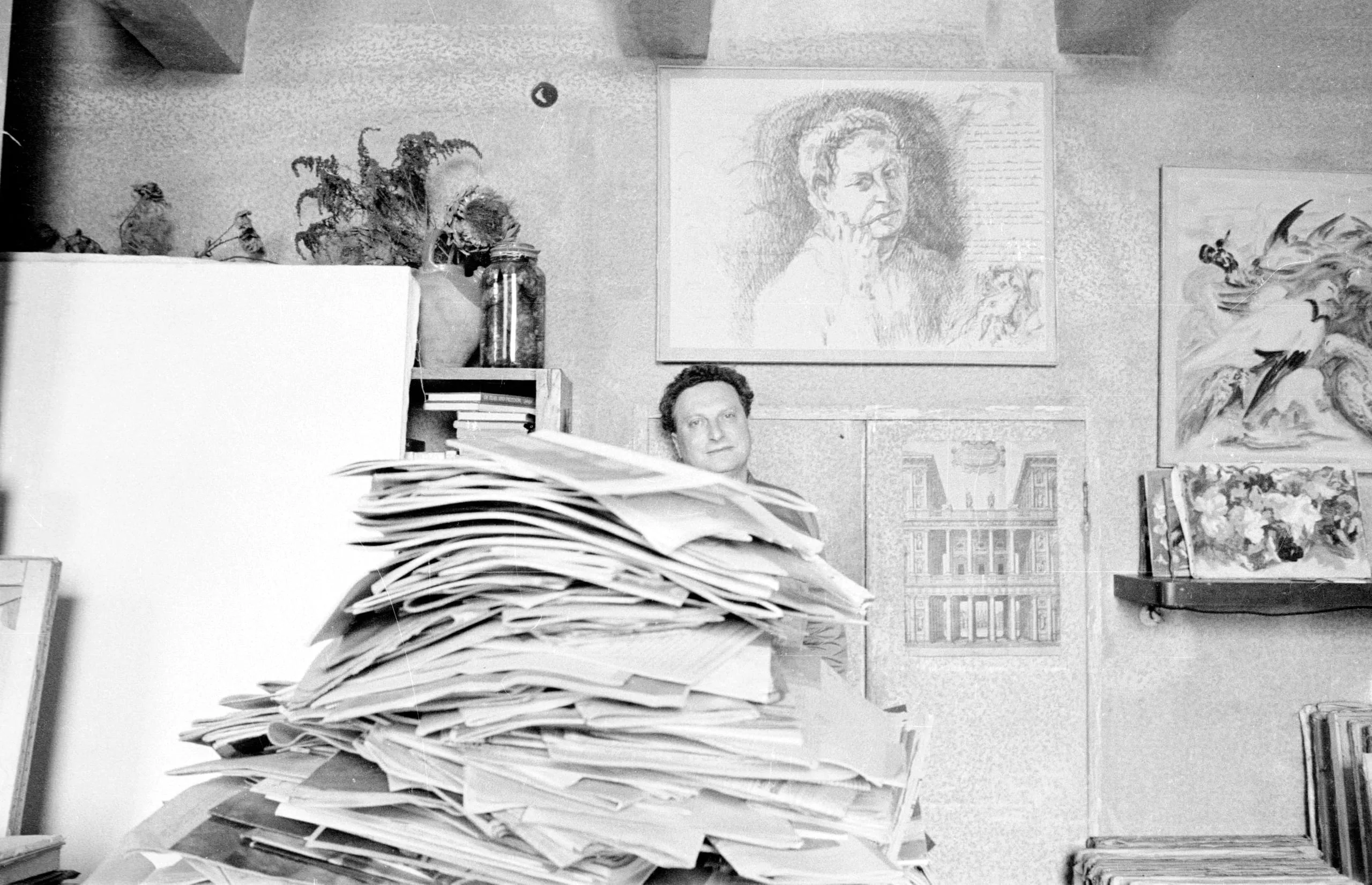 Black and white photograph of a man barely visible behind a large, unstable stack of papers in an artist's studio, drawings and paintings covering the wall behind him