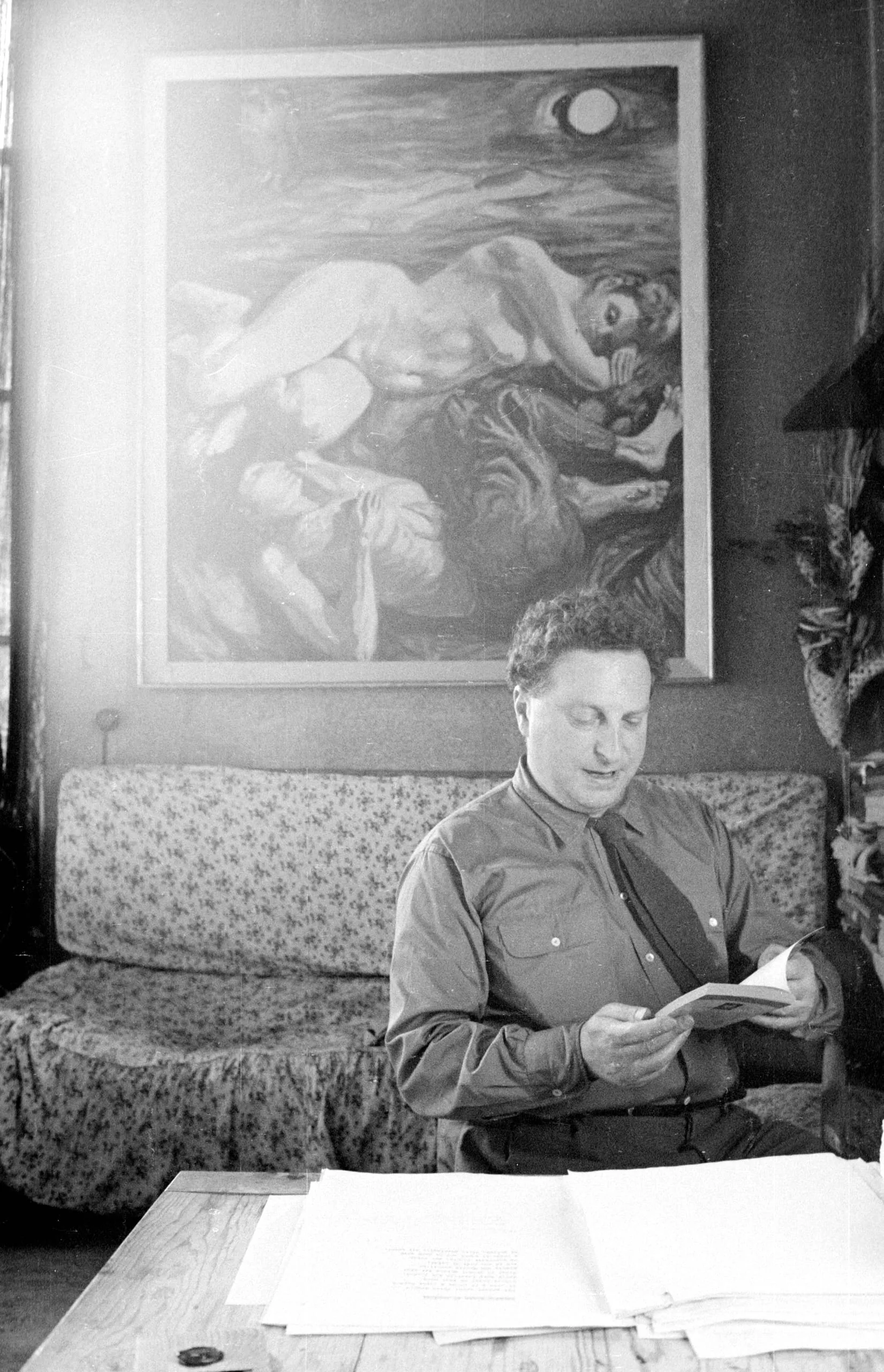 Black and white photograph of a man reading an open book at a table covered in papers, a large figurative painting of reclining nudes visible on the wall behind him