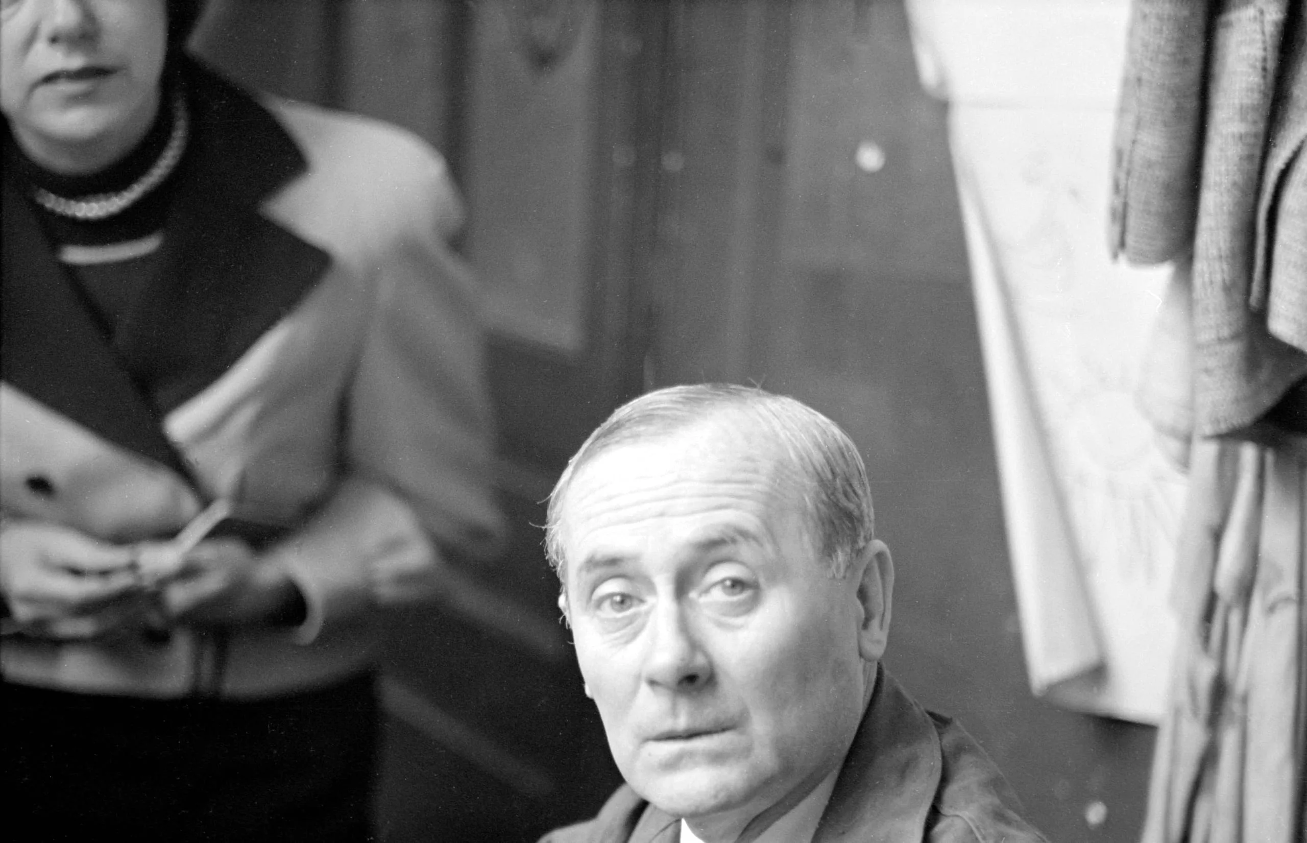 Black and white photograph, white man seated and looking at the camera, soft-focus woman standing behind him to the left