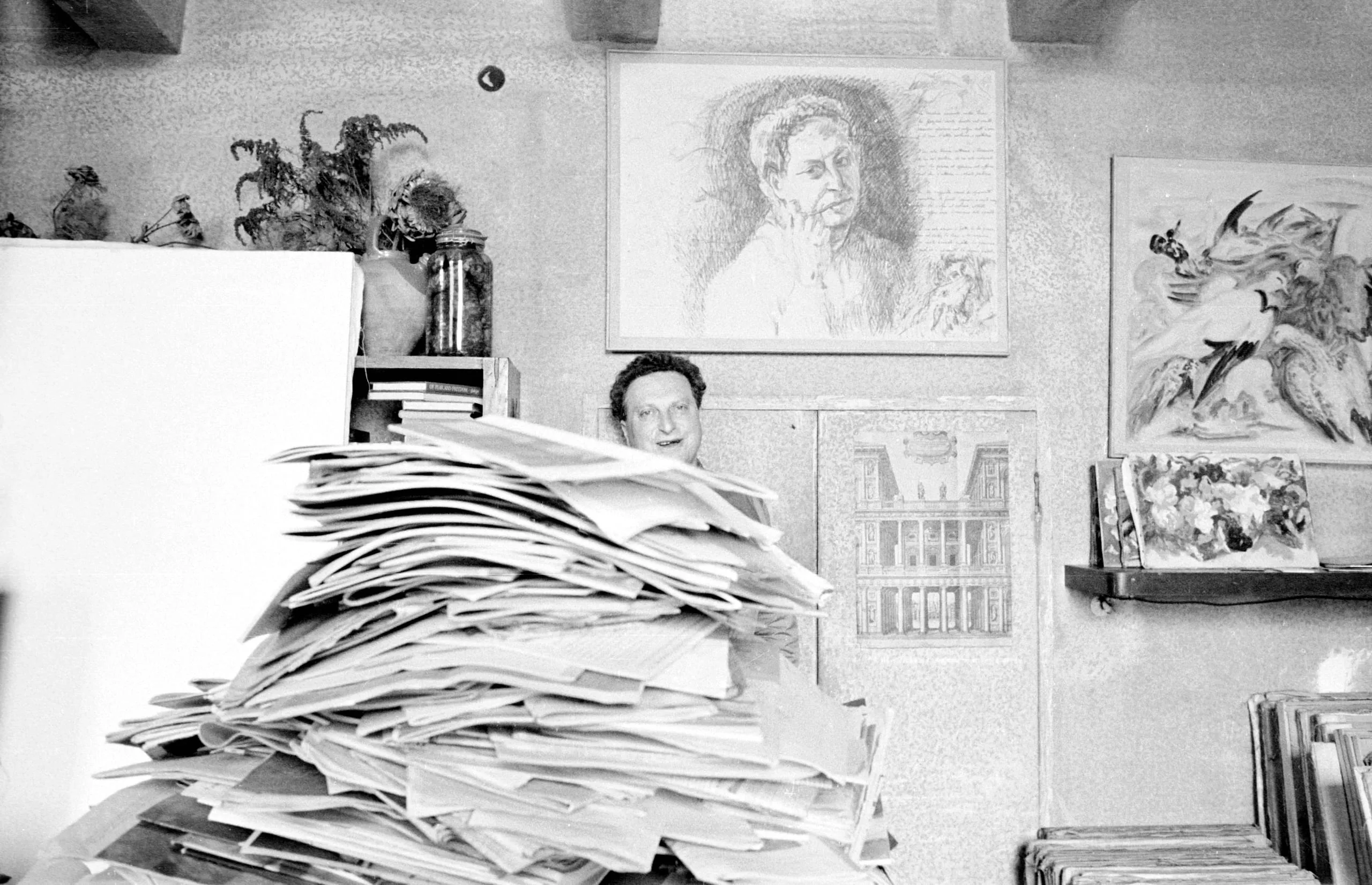 Black and white photograph of a man's face peering over a towering, chaotic stack of loose papers in an artist's studio, drawings and paintings visible on the wall behind him