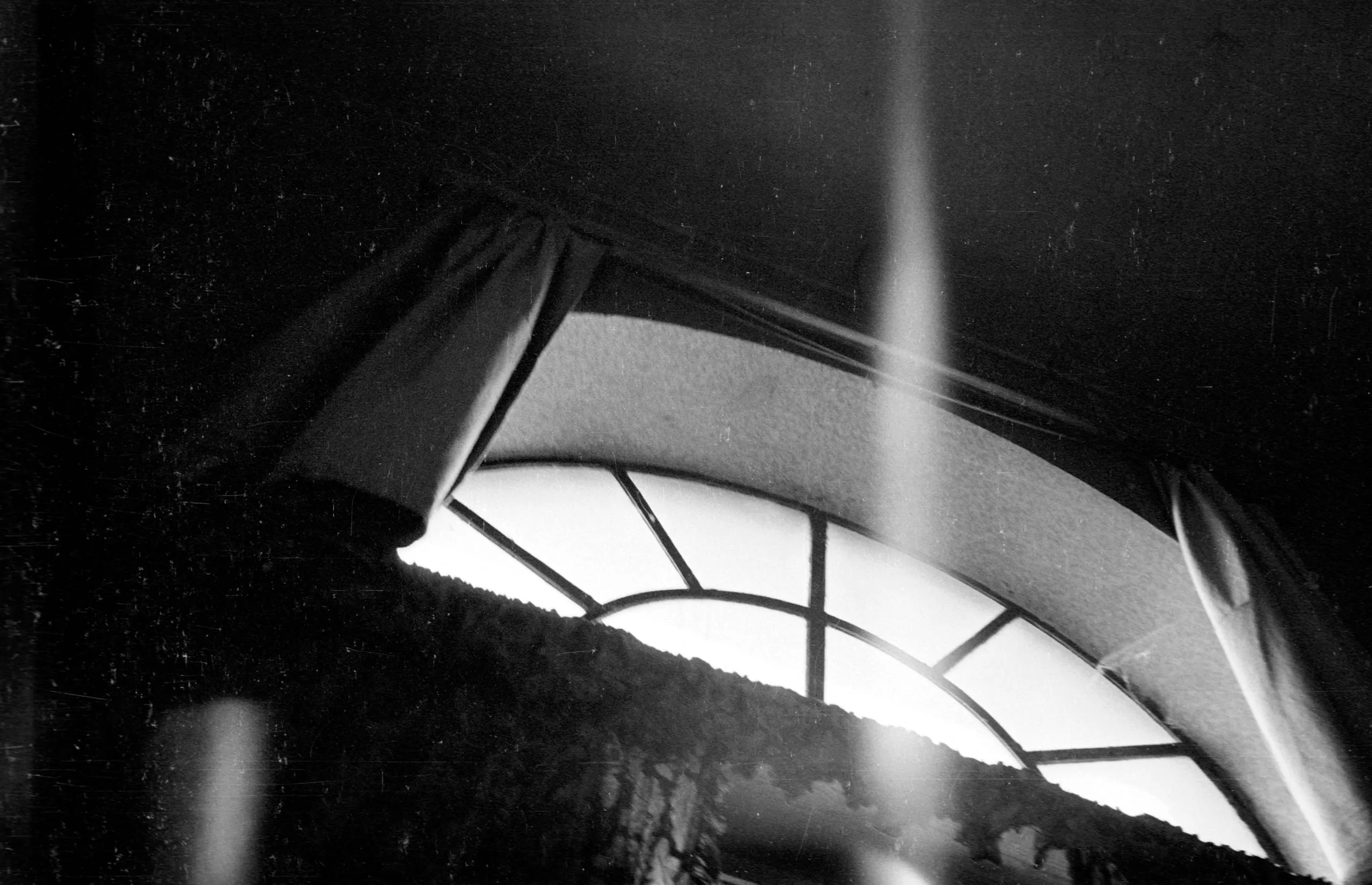 Black and white photograph looking up at a large arched multi-pane window glowing with bright light, flanked by dark curtains, with a diagonal lens flare cutting across the upper right