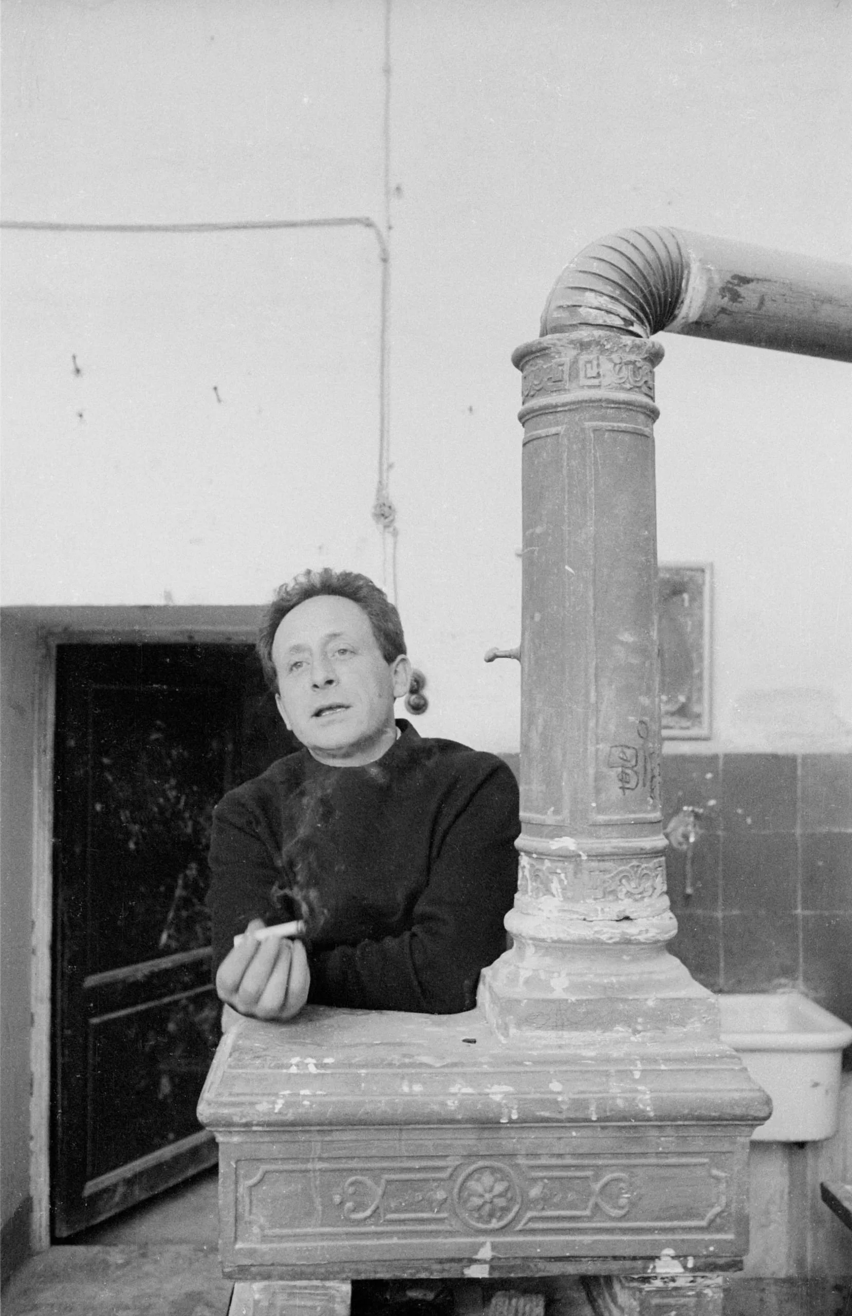 Black and white photograph of a man in a dark turtleneck leaning on an ornate cast-iron stove, holding a cigarette, gaze directed upward and to the side