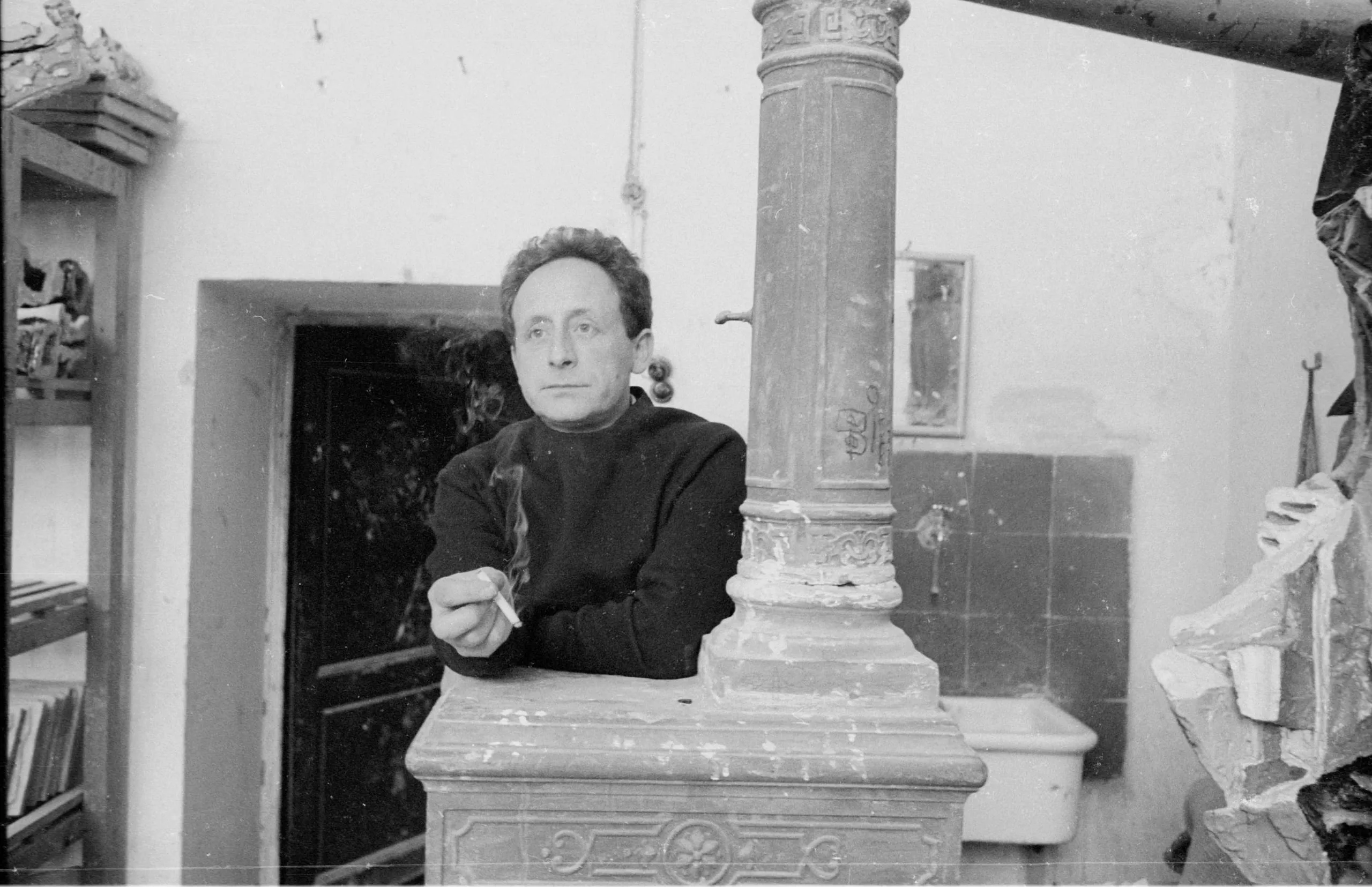 Black and white photograph of a man in a dark turtleneck leaning on an ornate stone pedestal, holding a lit cigarette, surrounded by artworks and shelving