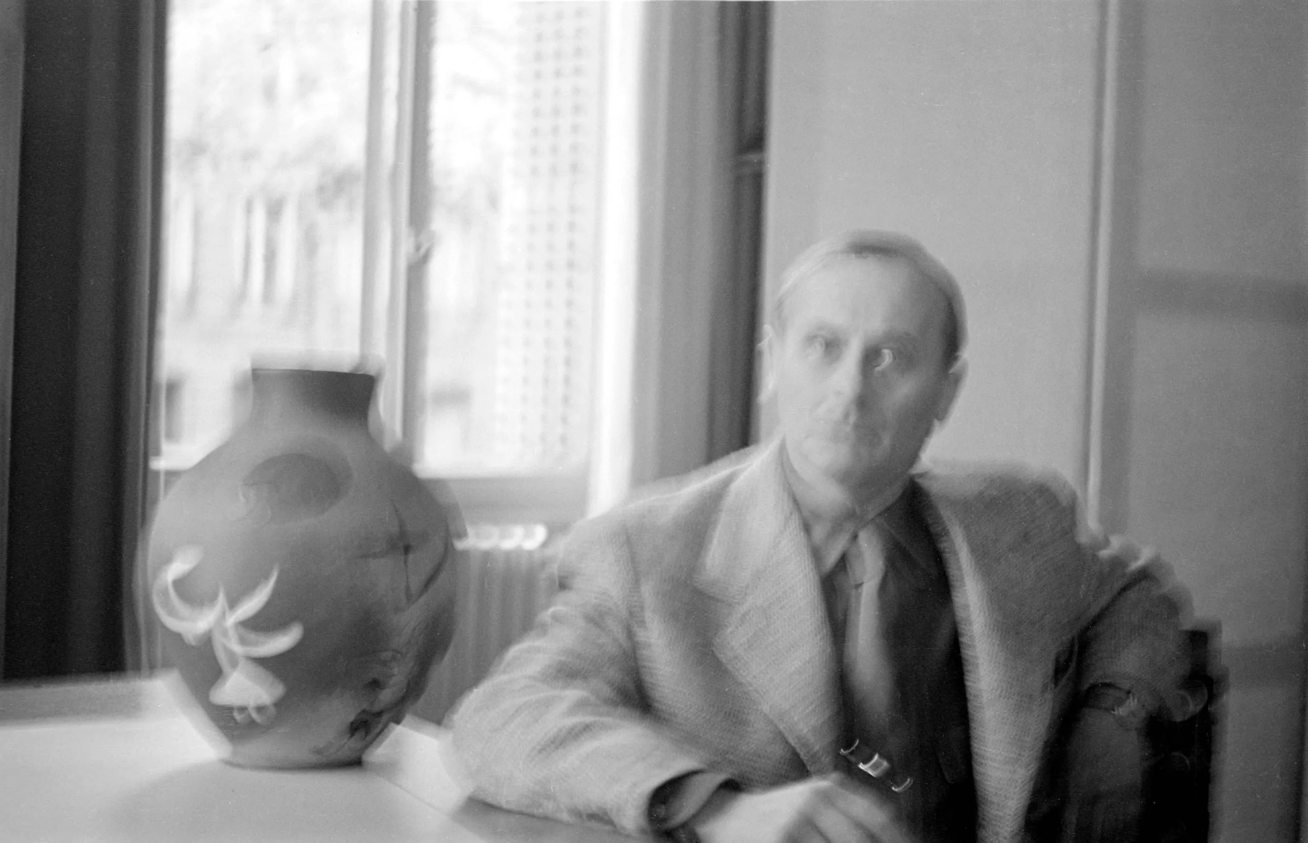 Blurred black and white photograph of a man in a blazer and tie seated at a table beside a rounded ceramic vase, soft window light behind him