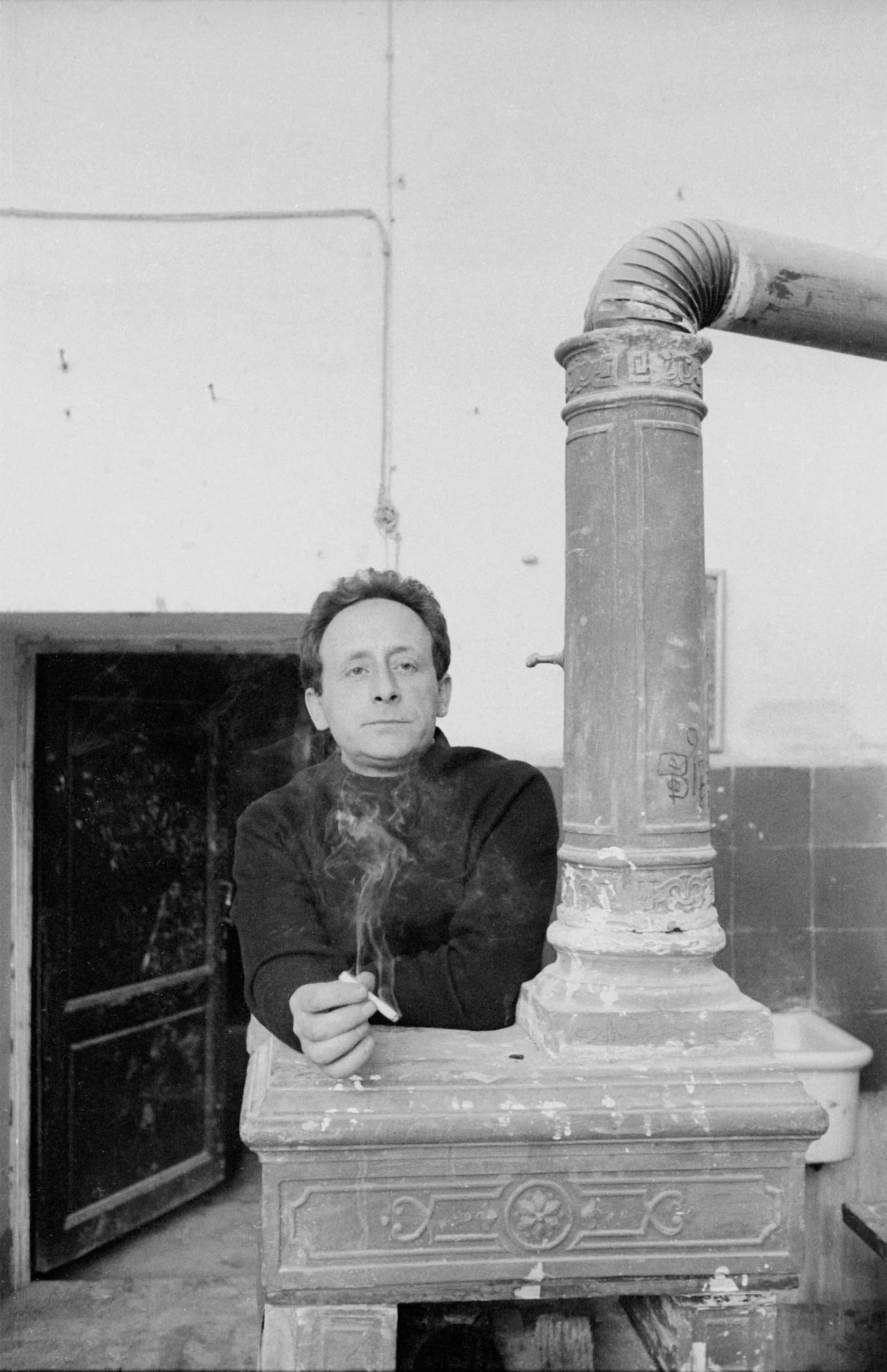 Black and white photograph, pale-skinned man in a dark turtleneck standing behind an ornate cast-iron stove, holding a lit cigarette with smoke curling upward