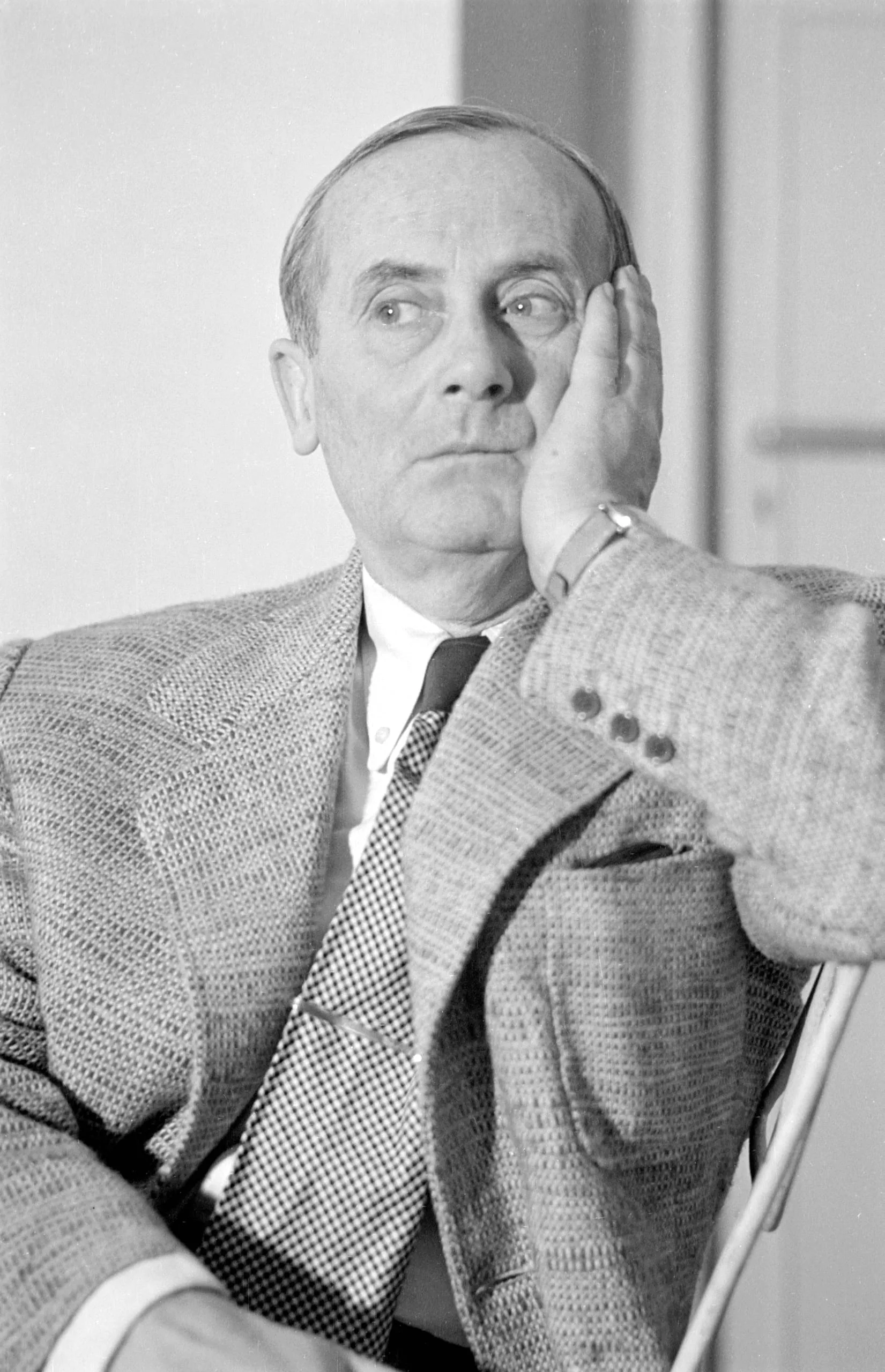 Black and white portrait photograph, white man seated and resting his cheek in his hand, gazing upward, wearing a tweed jacket and checked tie