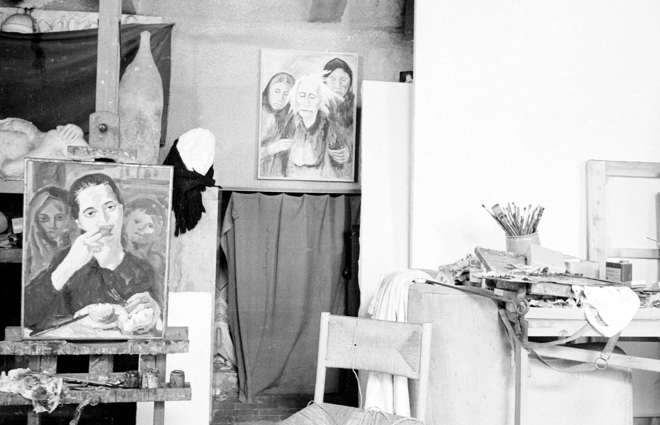 Black and white photograph of an artist's studio interior with two figurative paintings on easels, a draped curtain, and a worktable holding brushes and paint supplies