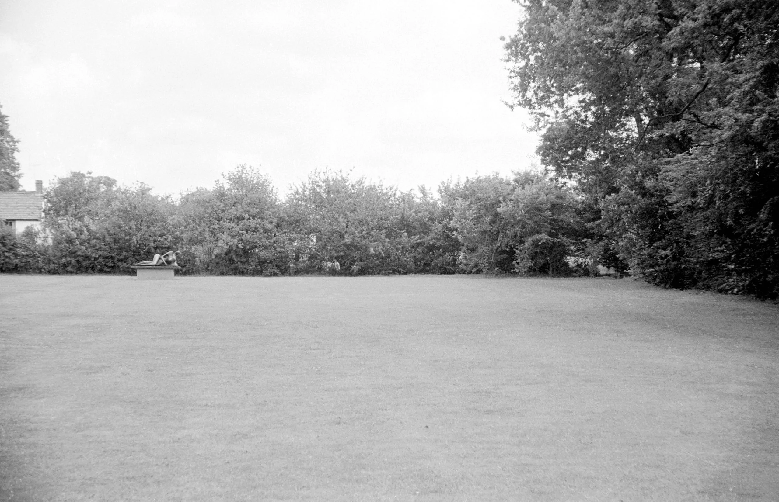 Black and white photograph of a wide, mowed lawn with a dense tree line in the distance, a building partially visible to the left, and a small unidentified object on a low structure near the left edge