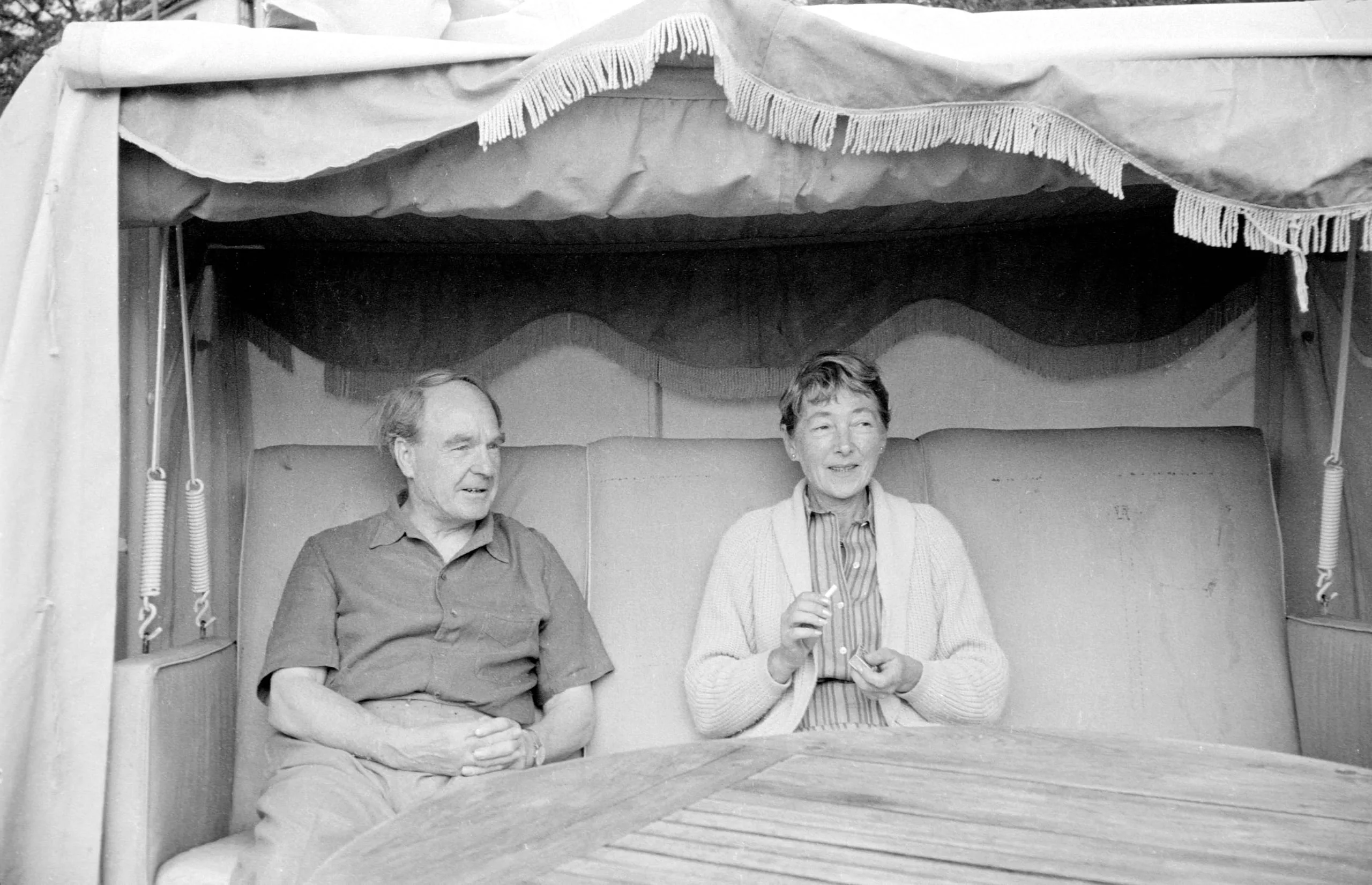Black and white photograph of a man and woman seated together inside a canopied beach chair with fringe trim and padded cushions
