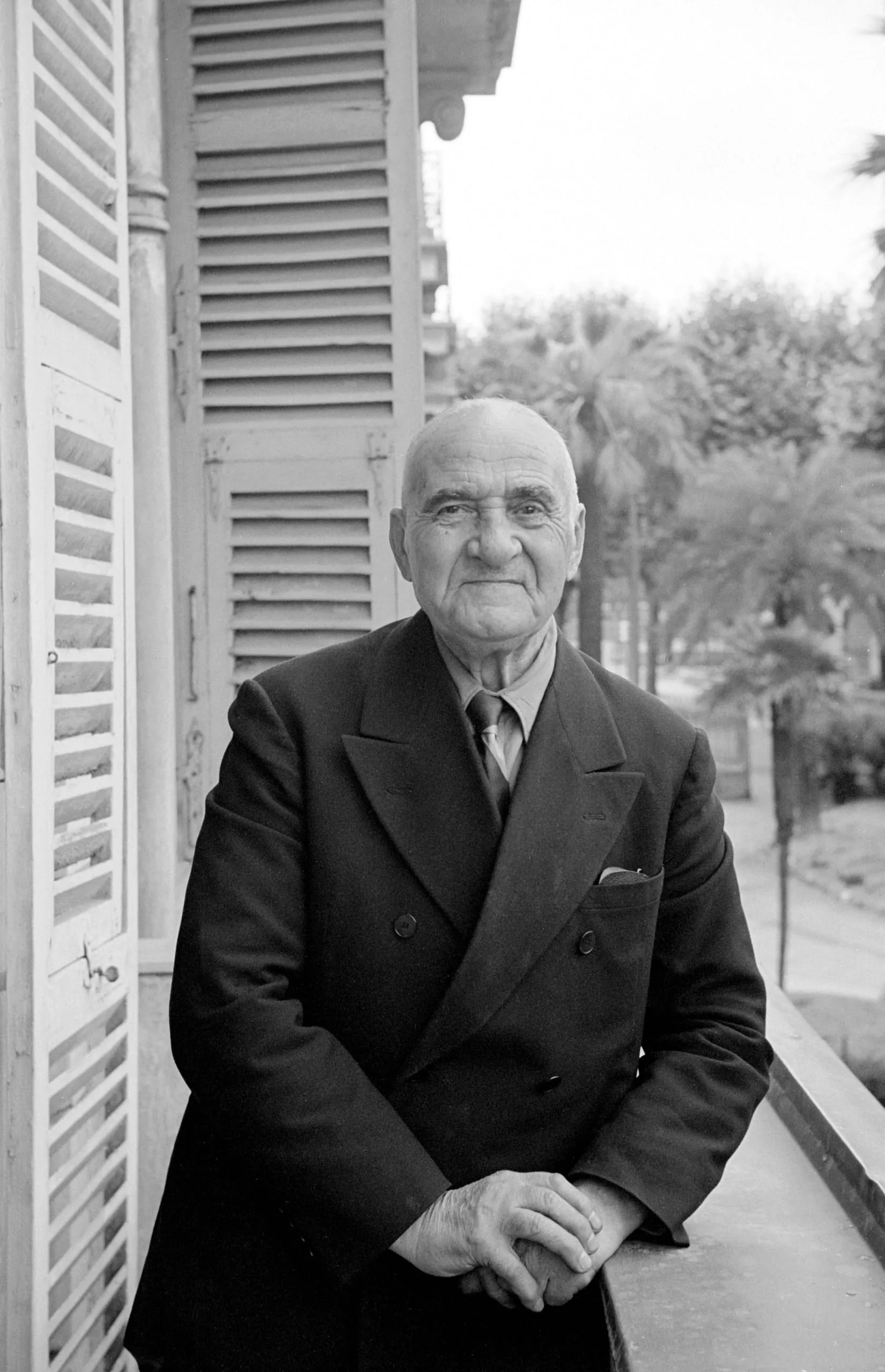 Black and white portrait photograph, elderly man in a double-breasted suit standing on a porch, hands clasped on a railing, palm trees visible behind him