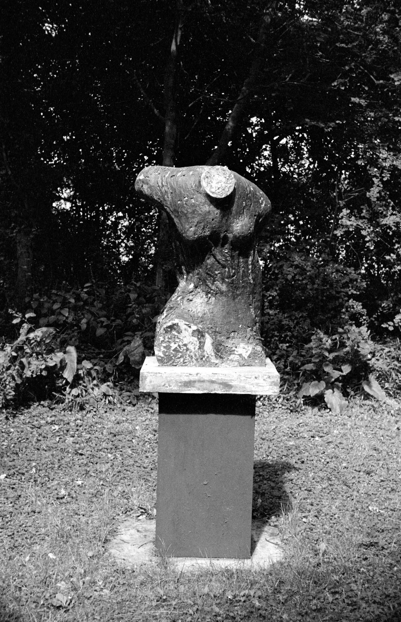 Black and white photograph of an abstract stone or concrete sculpture with a rough, eroded surface and twisted organic form, mounted on a dark rectangular pedestal in a garden