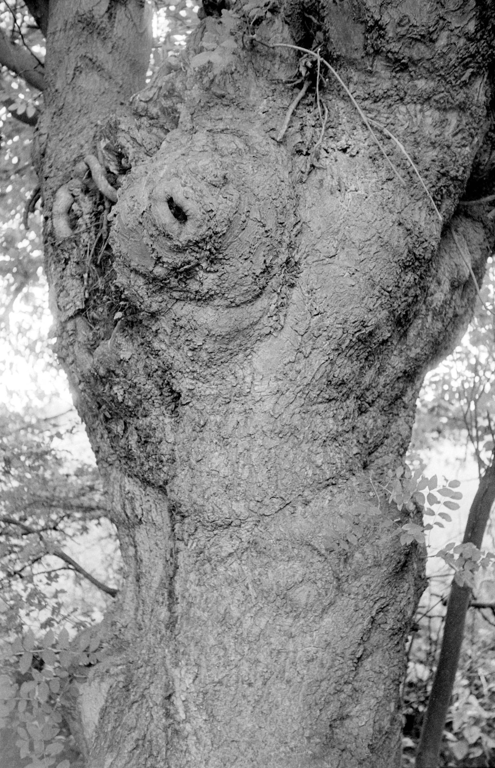 Black and white photograph of a massive, gnarled tree trunk filling the frame, with a large burl and rough, deeply ridged bark