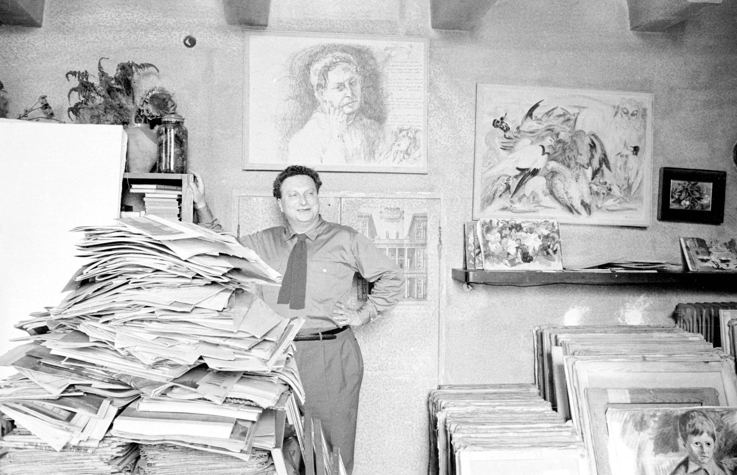 Black and white photograph of a man in a shirt and tie standing in an art studio beside a large stack of papers, surrounded by stored and hung artworks