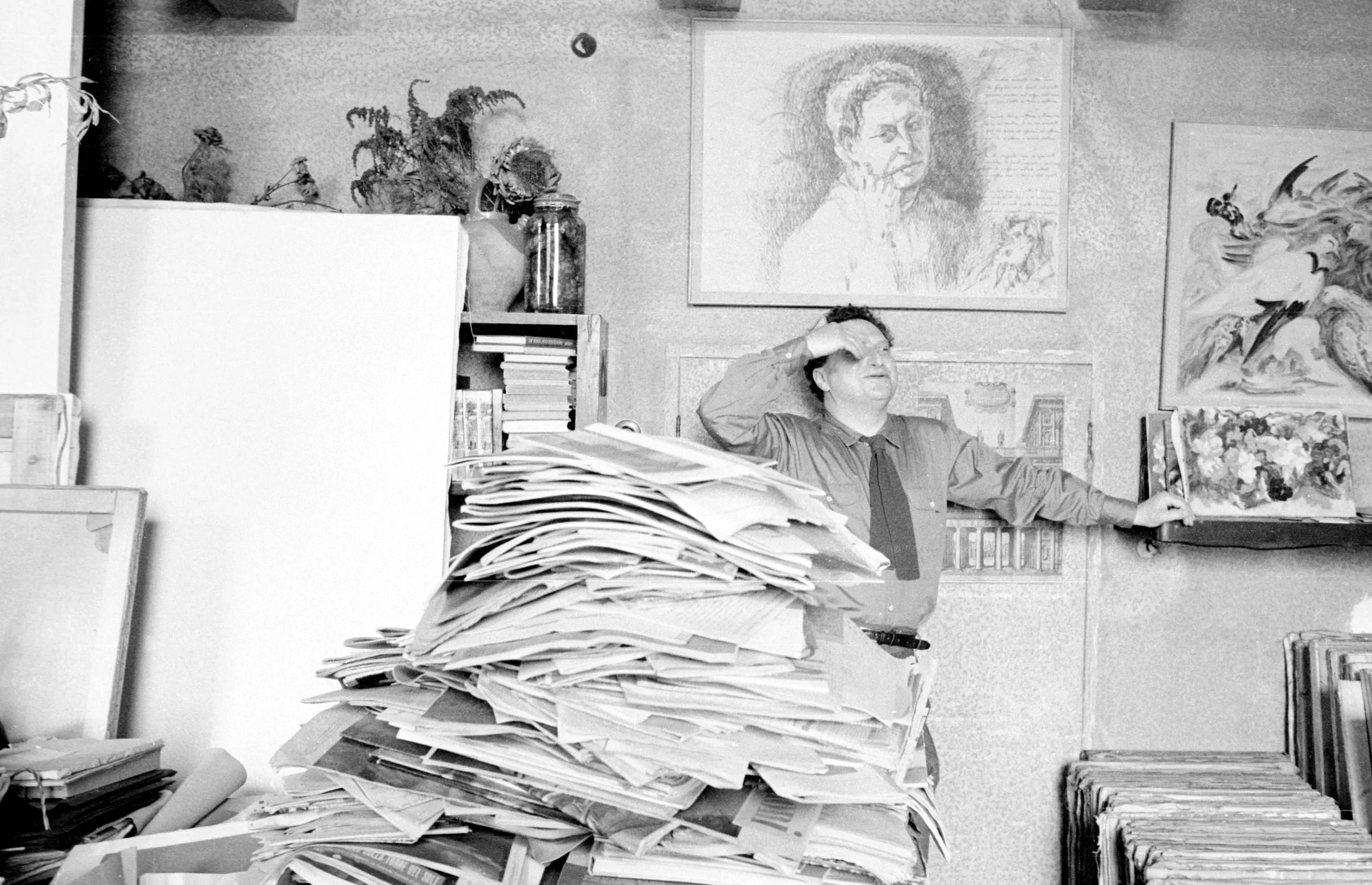 Black and white photograph of a man standing in a cluttered artist's studio behind a massive pile of papers, artworks hanging on the wall behind him