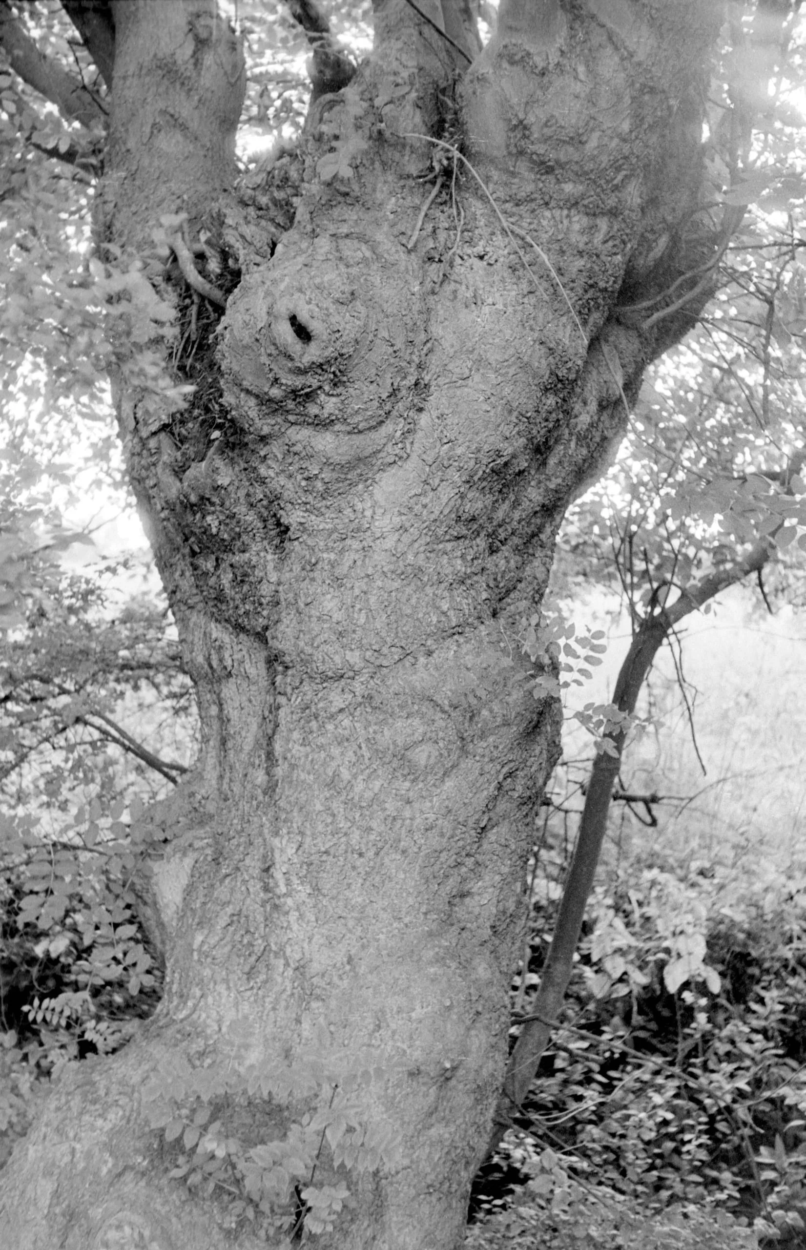 Black and white photograph of a massive, gnarled tree trunk with deeply furrowed bark and a prominent burl, surrounded by leafy woodland