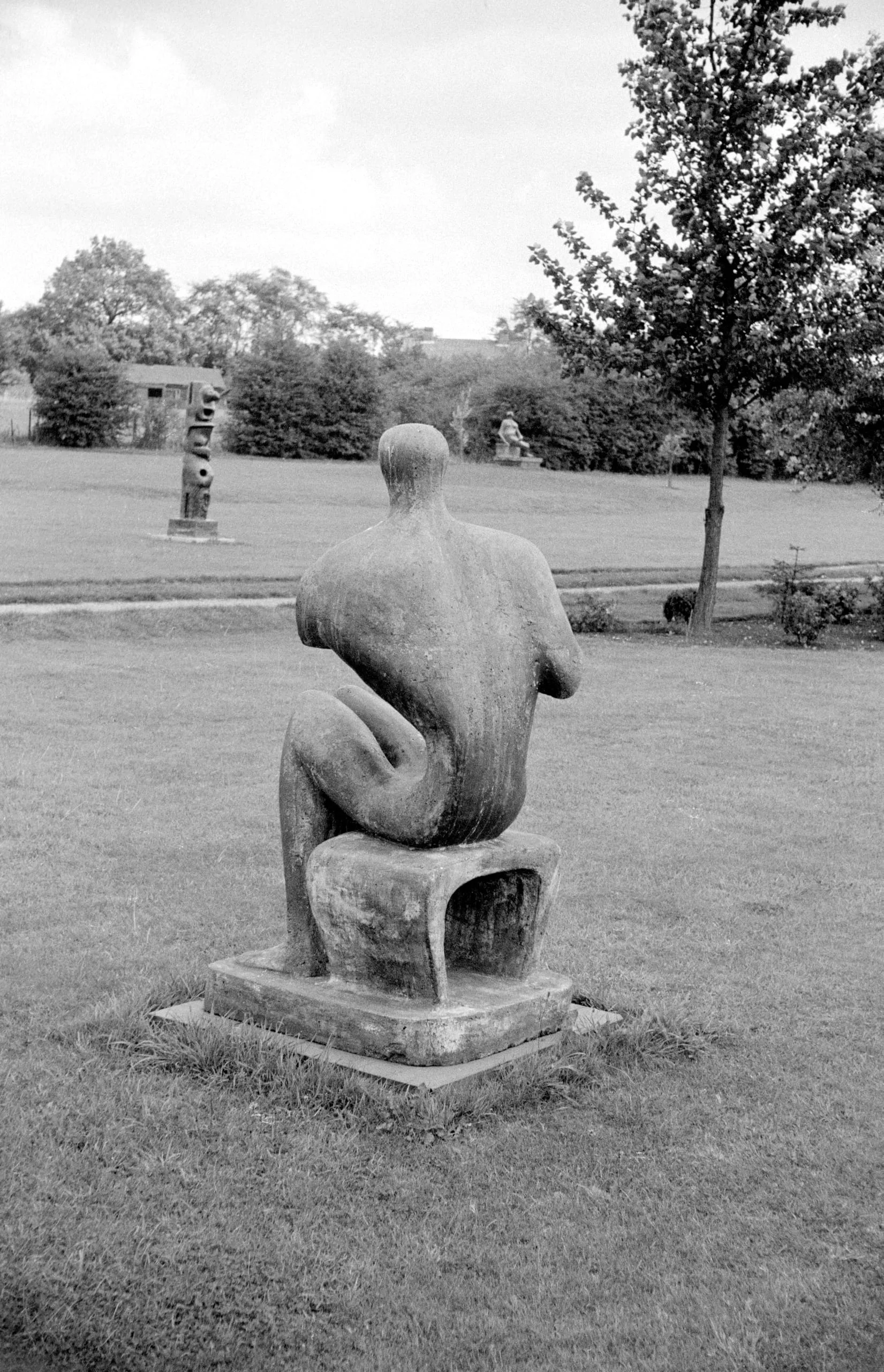 Black and white photograph of a large, simplified seated stone or bronze figure viewed from behind in an outdoor sculpture garden, with additional sculptures visible in the distance