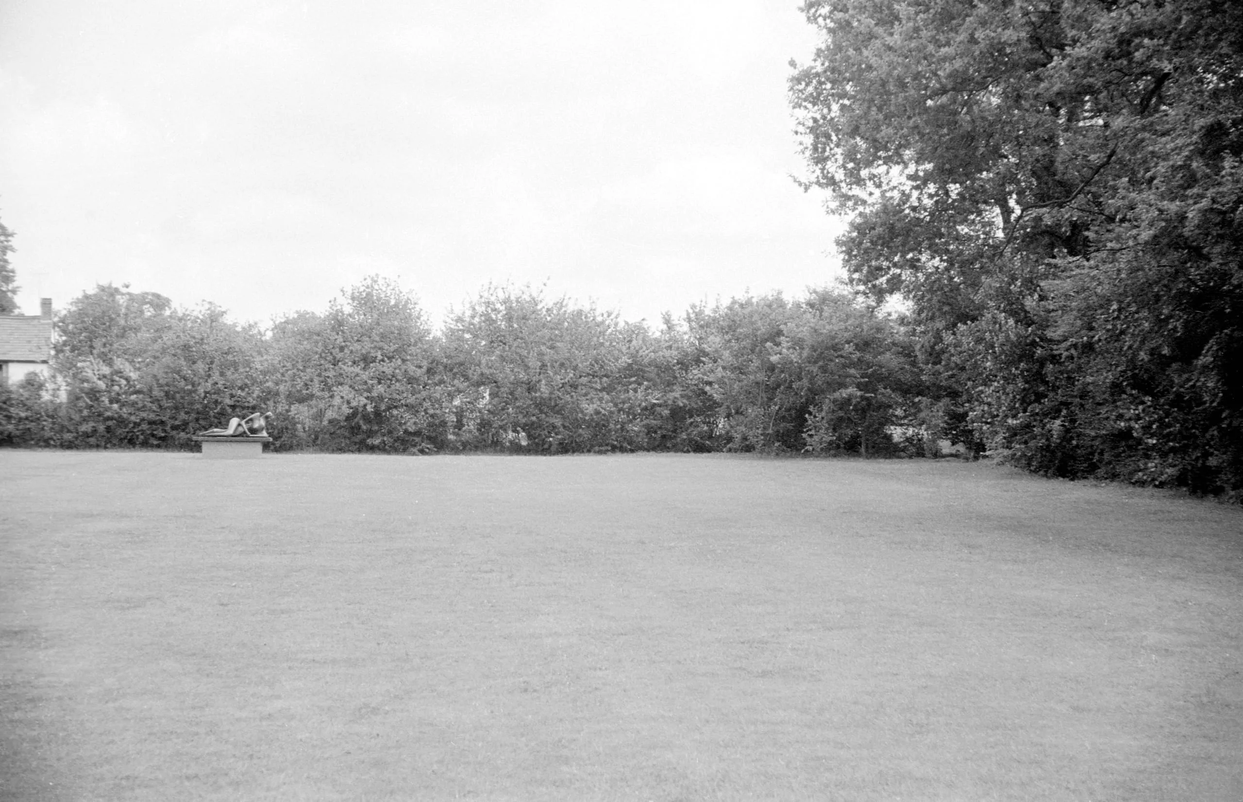 Black and white photograph of a wide, open lawn with a dense tree line, a partial view of a building at far left, and a small sculpture on a low plinth in the middle distance