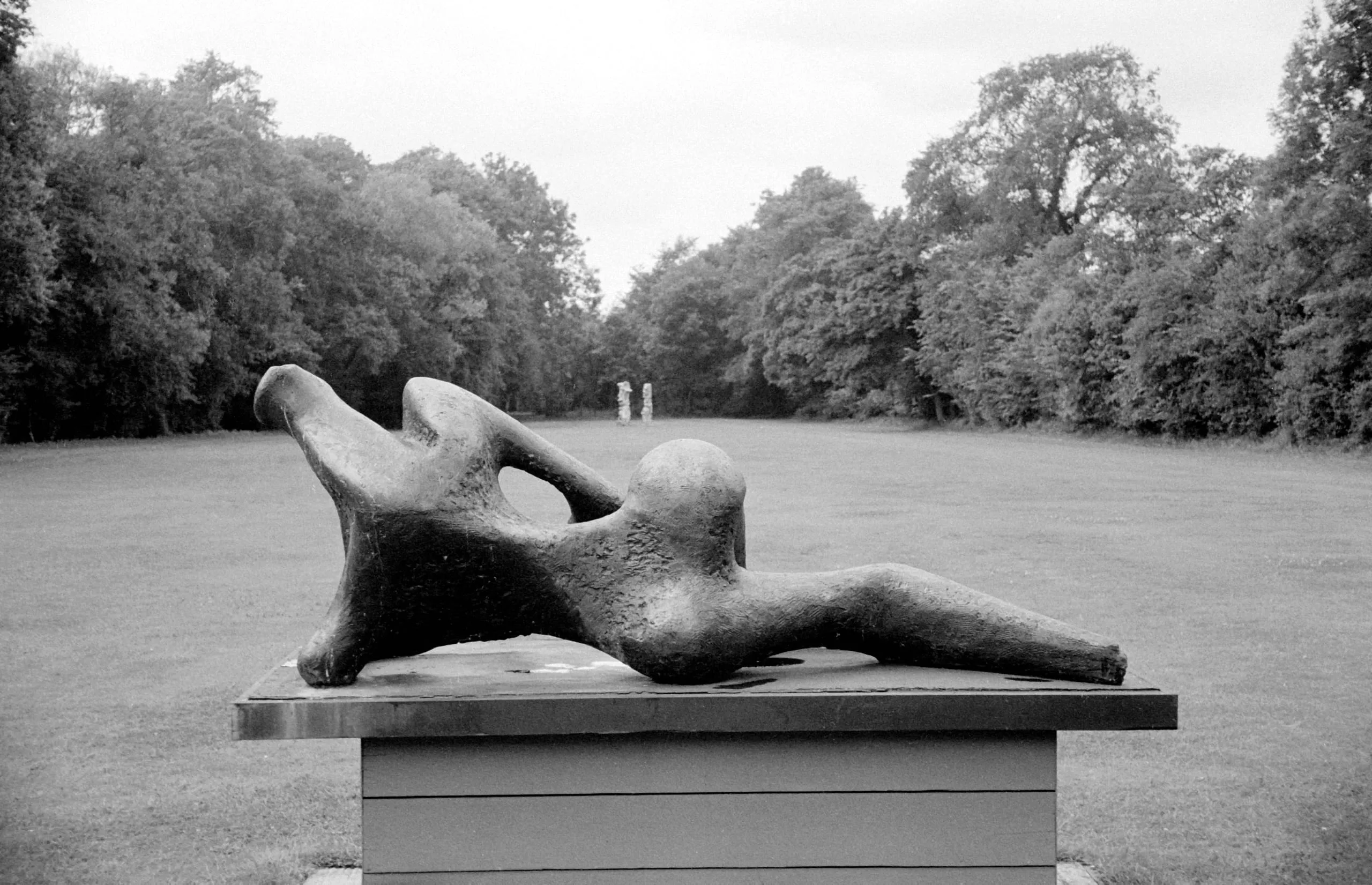 Black and white photograph of a large abstract bronze reclining figure sculpture on a low wooden pedestal, set in an open lawn with trees behind