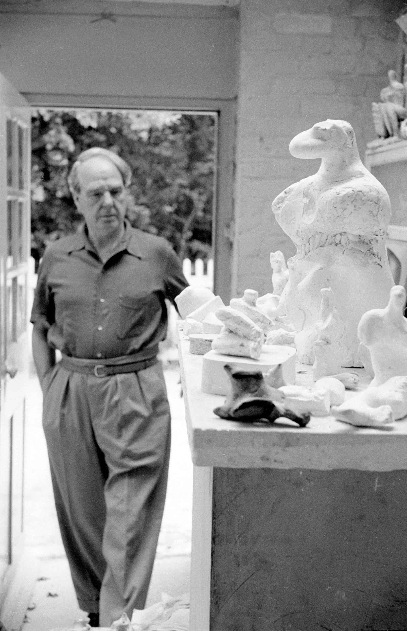 Black and white photograph of a man in a short-sleeved shirt standing beside a worktable covered with white plaster sculptures in an artist's studio