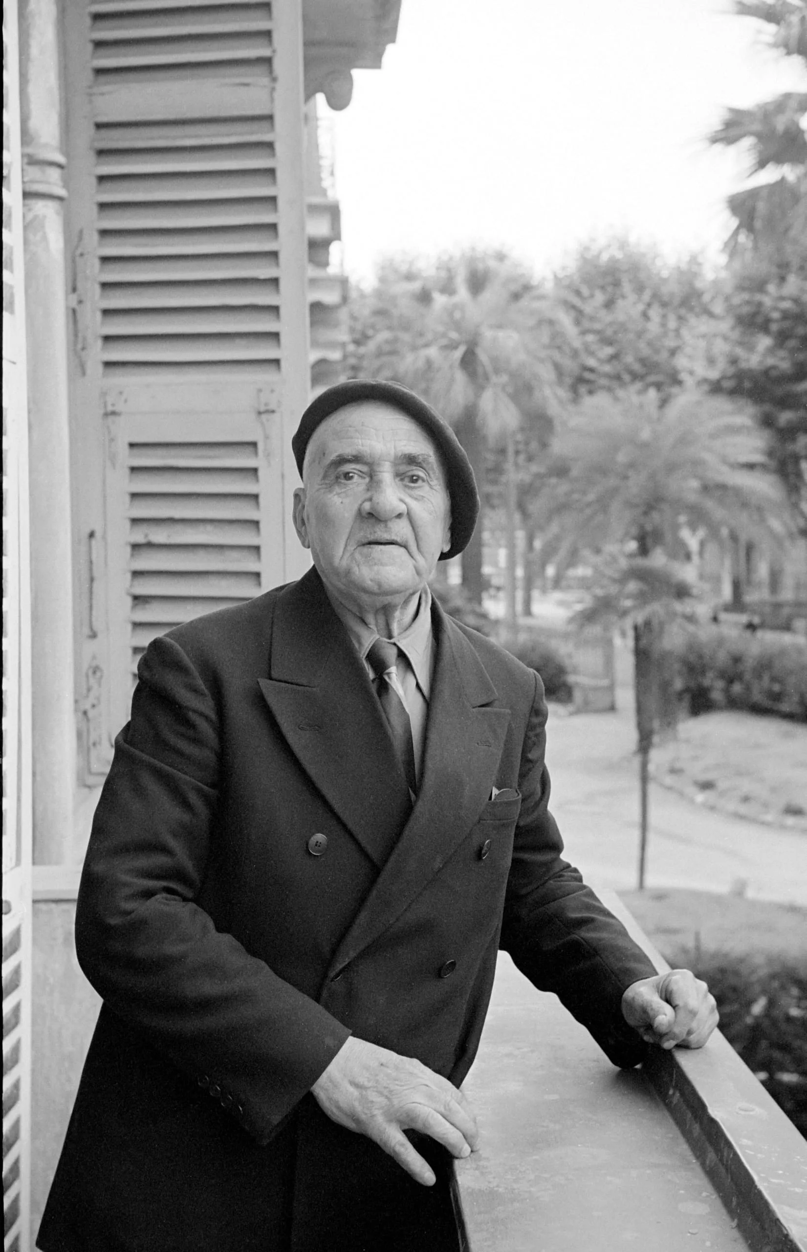 Black and white photograph of an elderly white man in a beret and double-breasted overcoat, leaning against a balcony railing with palm trees in the distance