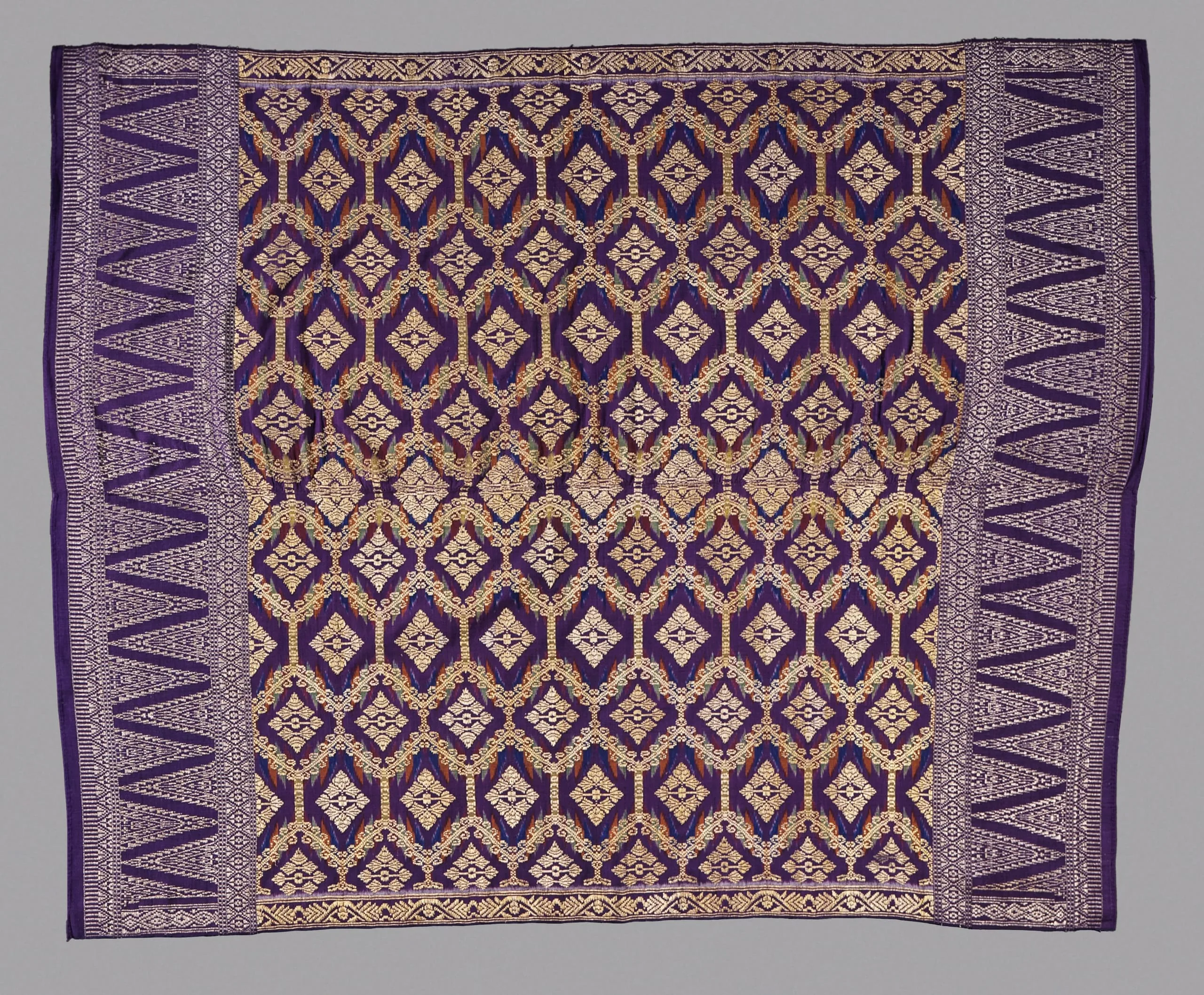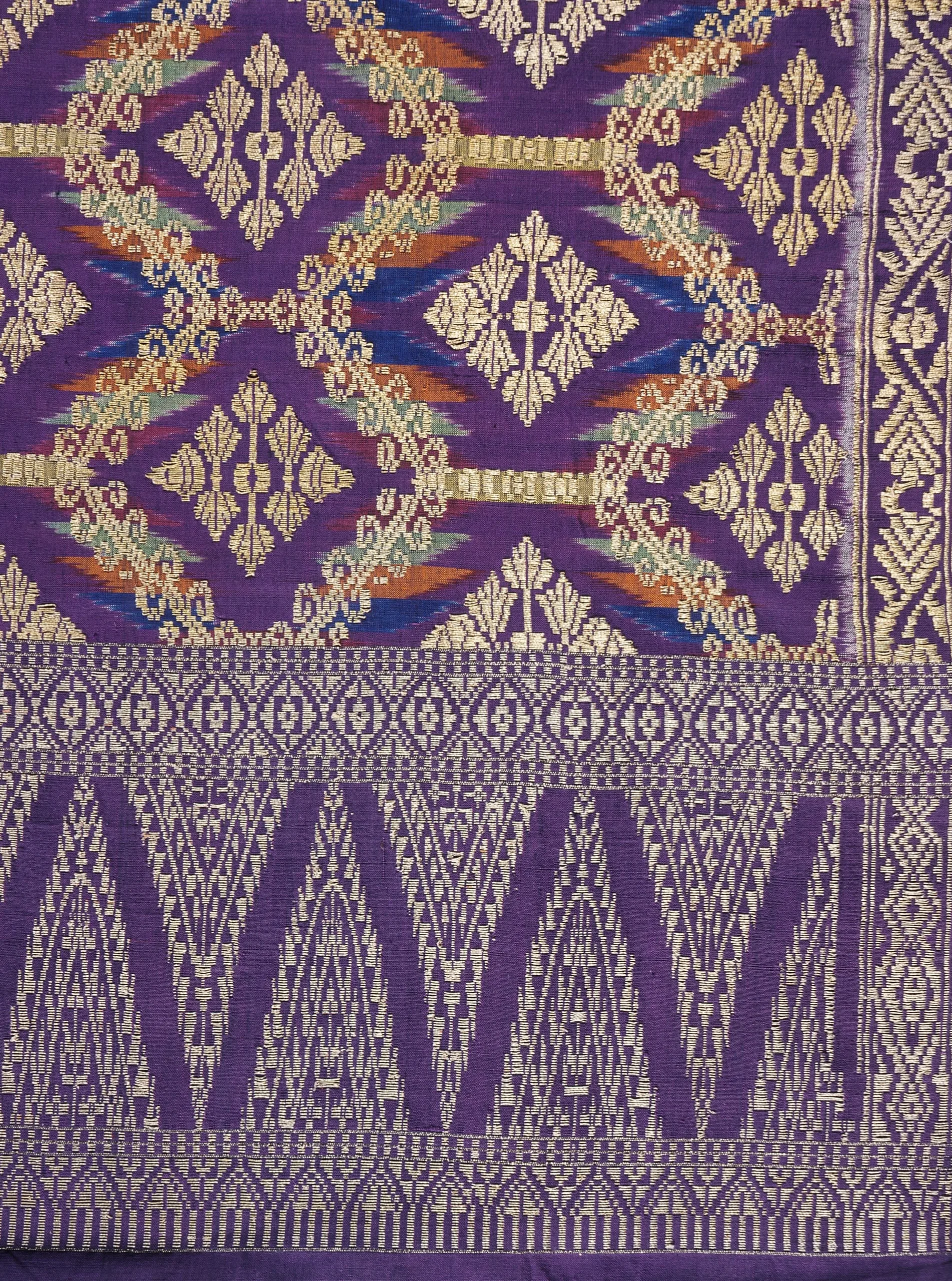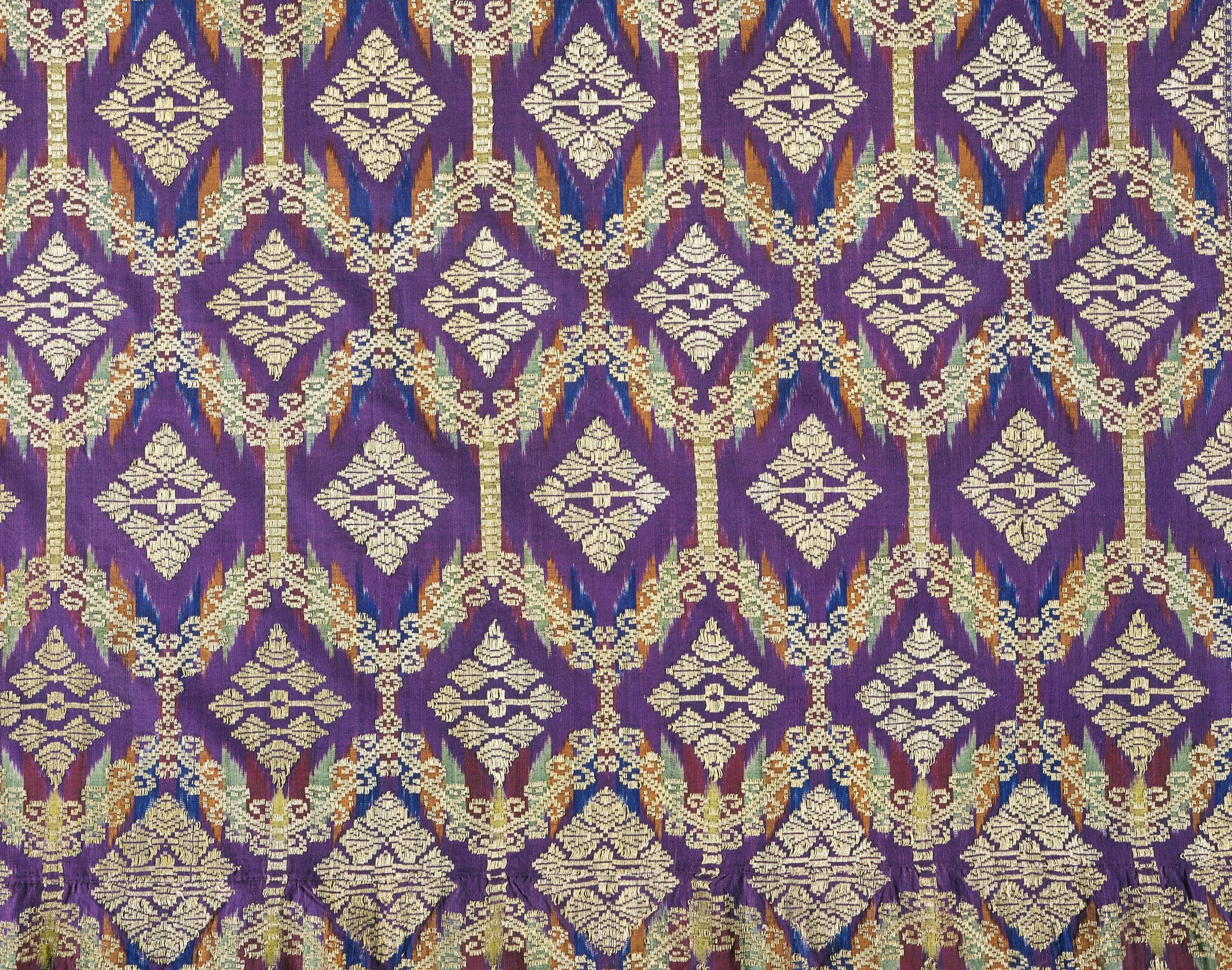 - Silk with weft-resist dye (ikat) and supplementary gold and silver metallic thread (songket)